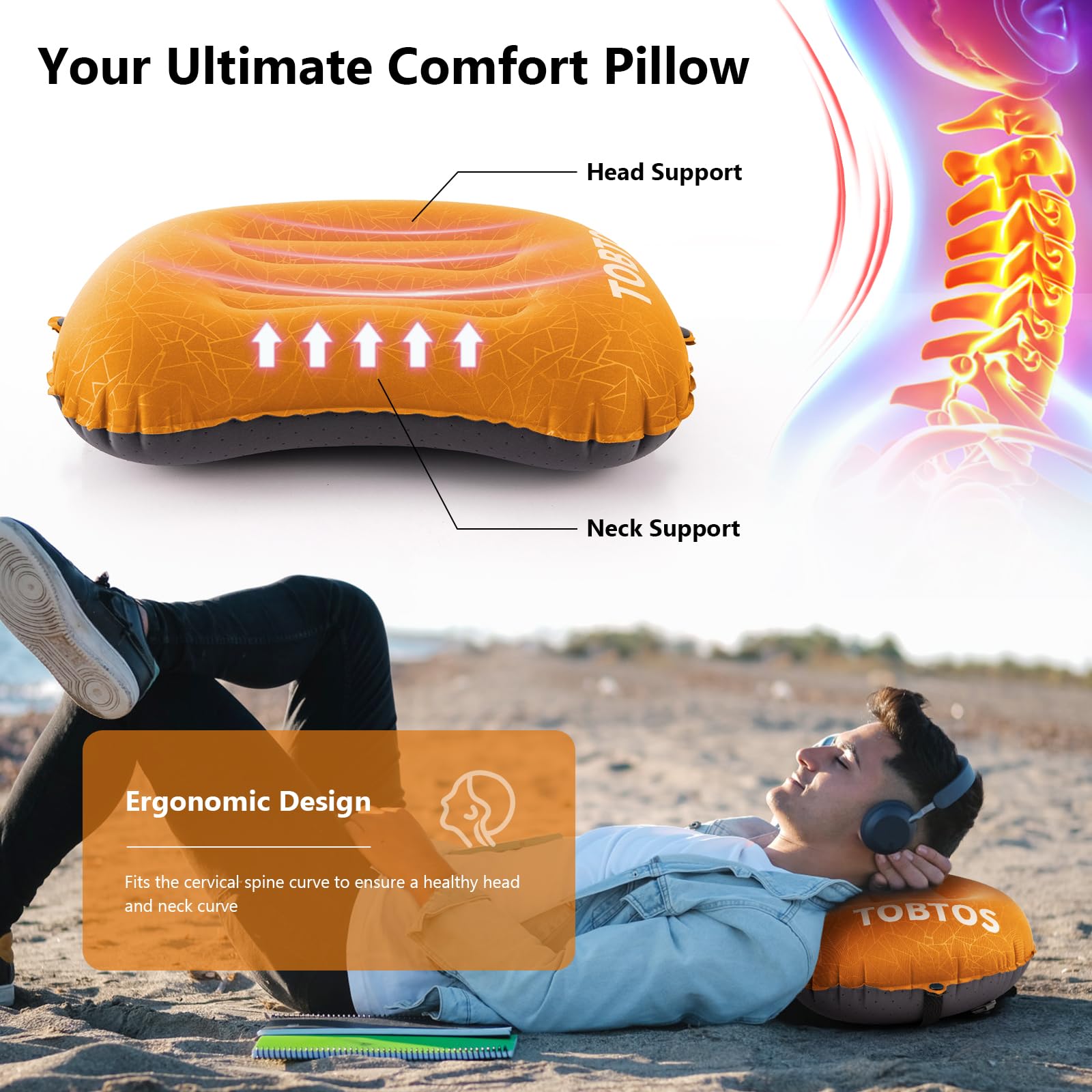 TOBTOS Inflatable Camping Pillow for Camping, Ultralight Backpacking Pillow, Ergonomic Support for Neck & Lumbar, Blow Up Air for Travel, Hiking, Outdoor (Orange)