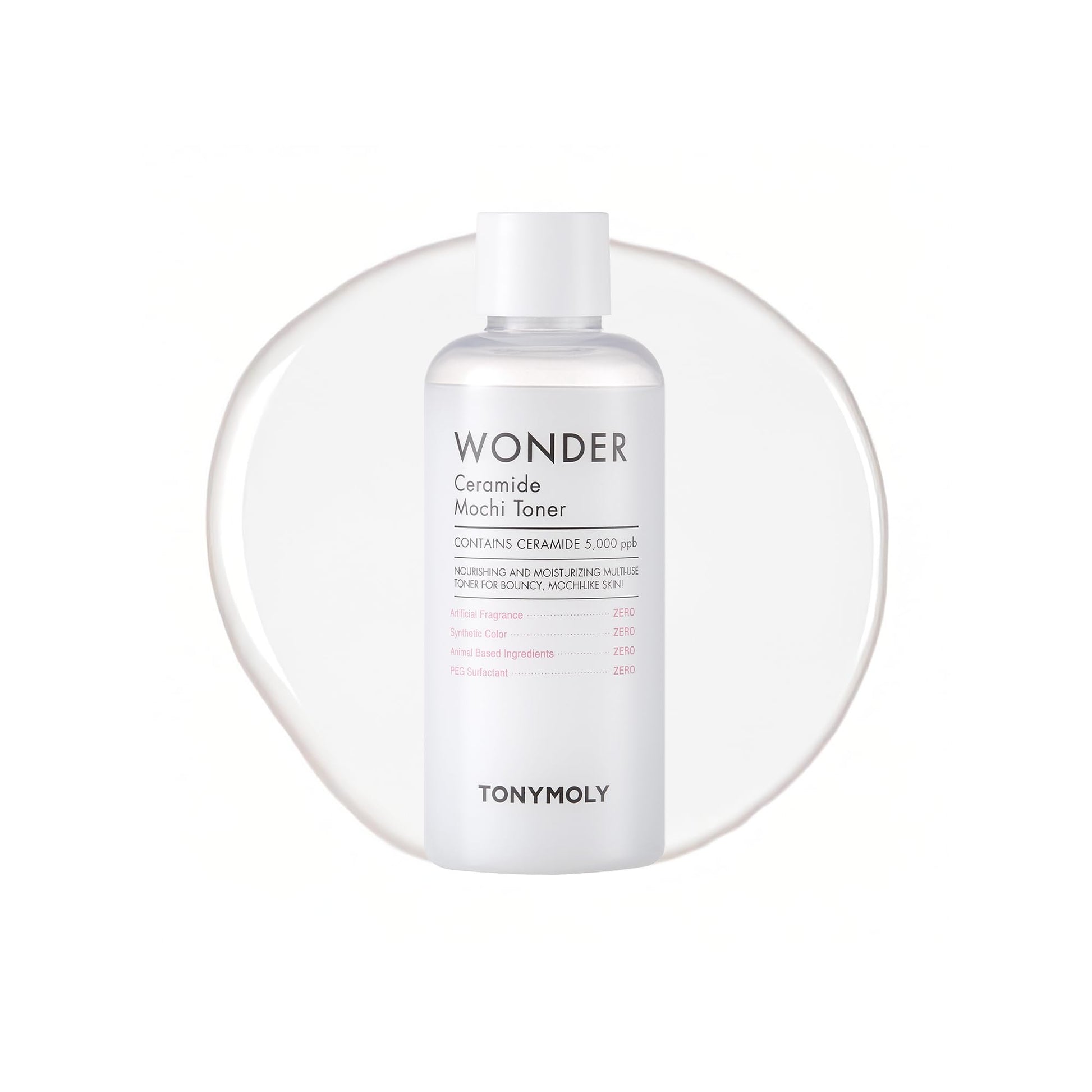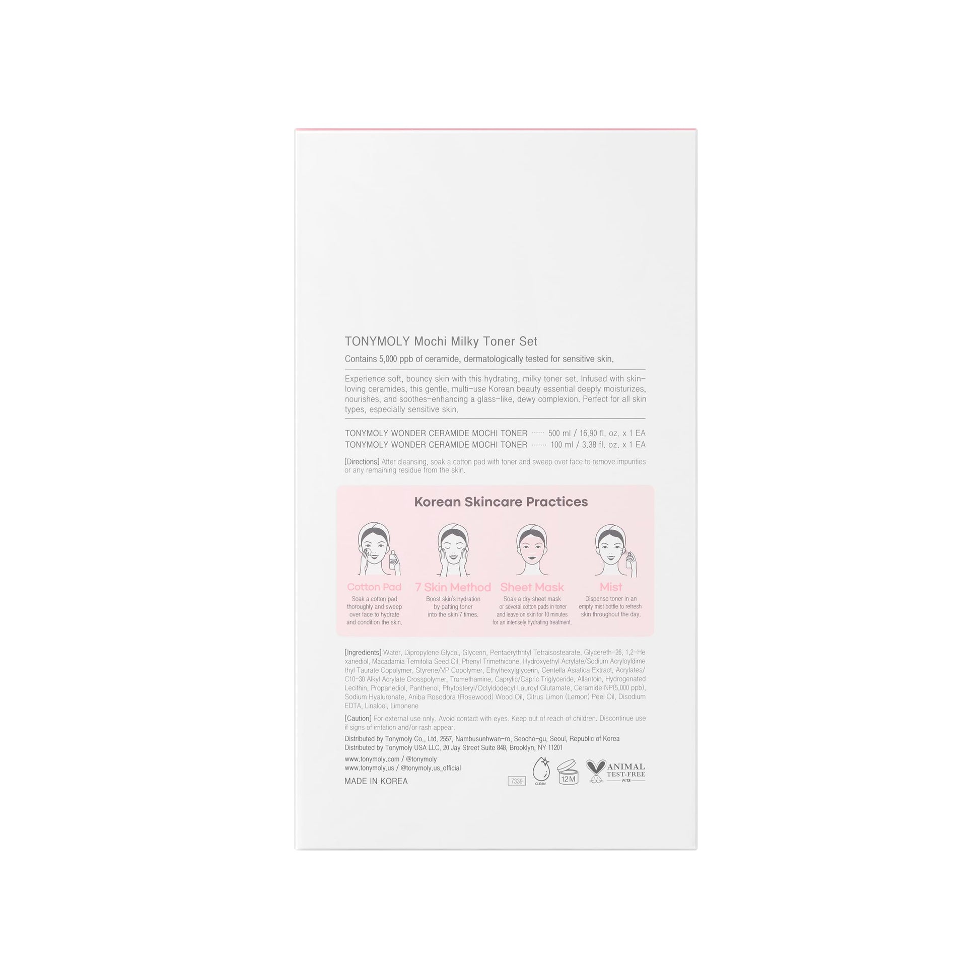 Details: Transform your skincare routine with TONYMOLY's Wonder Ceramide Mochi Milky Toner Set, featuring a generous 16.90 fl. oz bottle plus a travel-friendly 3.38 fl. oz size. This K-beauty bestseller contains 5,000 ppb of ceramide, delivering deep hydration while supporting your skin's natural moisture barrier. The milky, gentle formula creates a dewy, glass-like complexion and is suitable for all skin types, particularly those with sensitive skin. Perfect for multiple application methods - use with a cotton pad for traditional toning, try the 7-skin method for intense hydration, or transform it into a sheet mask treatment. The light citrus-scented toner helps remove impurities while nourishing and moisturizing your skin. This set includes clear usage instructions and is dermatologically tested. For external use only - if irritation occurs, discontinue use.