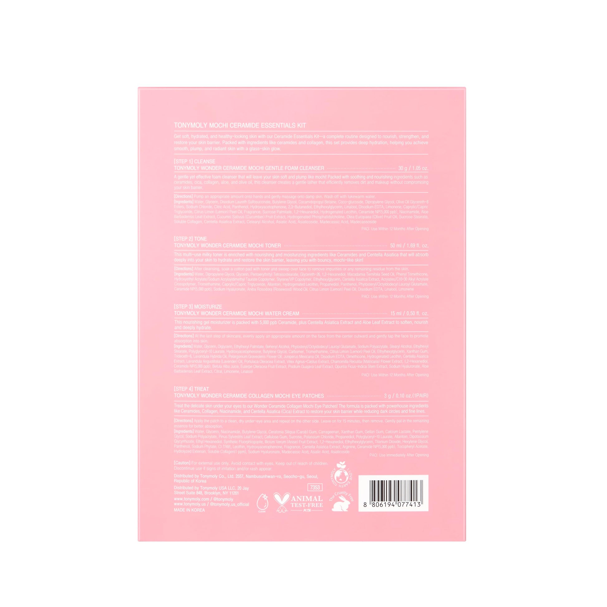 Details: Transform your skincare routine with this comprehensive Mochi Ceramide Essentials Kit from TONYMOLY. This complete four-step system includes a gentle foam cleanser, milky toner, water cream, and eye patches - all infused with powerful ceramides and collagen to strengthen your skin barrier. The cleanser delicately removes impurities while maintaining skin's moisture, followed by the hydrating toner that preps skin for optimal absorption. The lightweight water cream delivers deep moisture without heaviness, while the specialized eye patches target dark circles and fine lines. Perfect for all skin types, this kit creates a spa-like experience at home. Each product works in harmony to help you achieve soft, plump, and radiant skin. The set includes generously sized products packaged in a convenient kit that makes an ideal introduction to Korean skincare essentials or a perfect refresh for your existing routine.