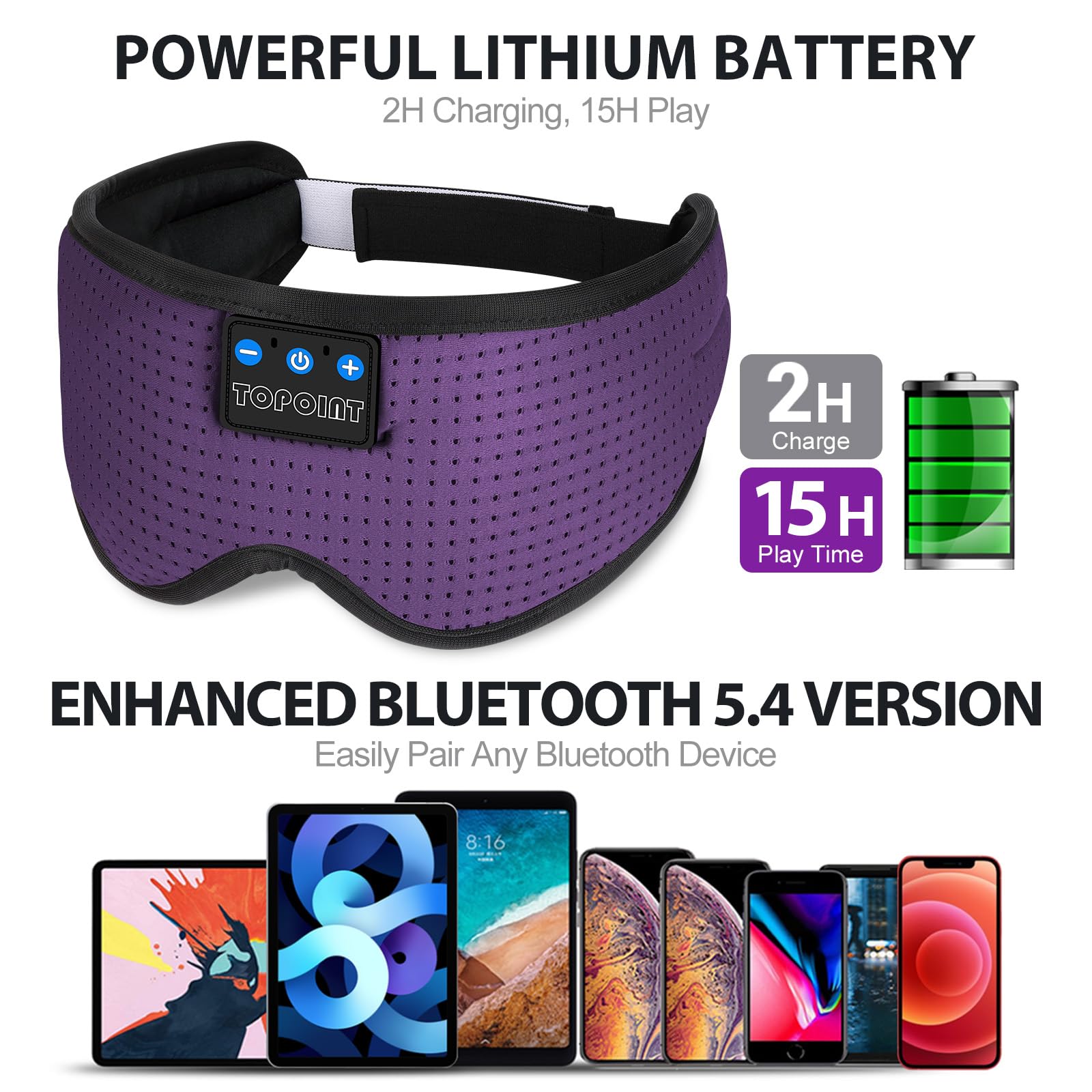 - 【Excellent Stereo Sound Quality】TOPOINT Sleeping Headphones Has True HD high fidelity sound featuring latest Bluetooth 5.4 technology that produce great sound quality and easily pairs with smartphones, computers, and most other Bluetooth compatible devices. Please you can move the position of the speakers to fit ears before use.