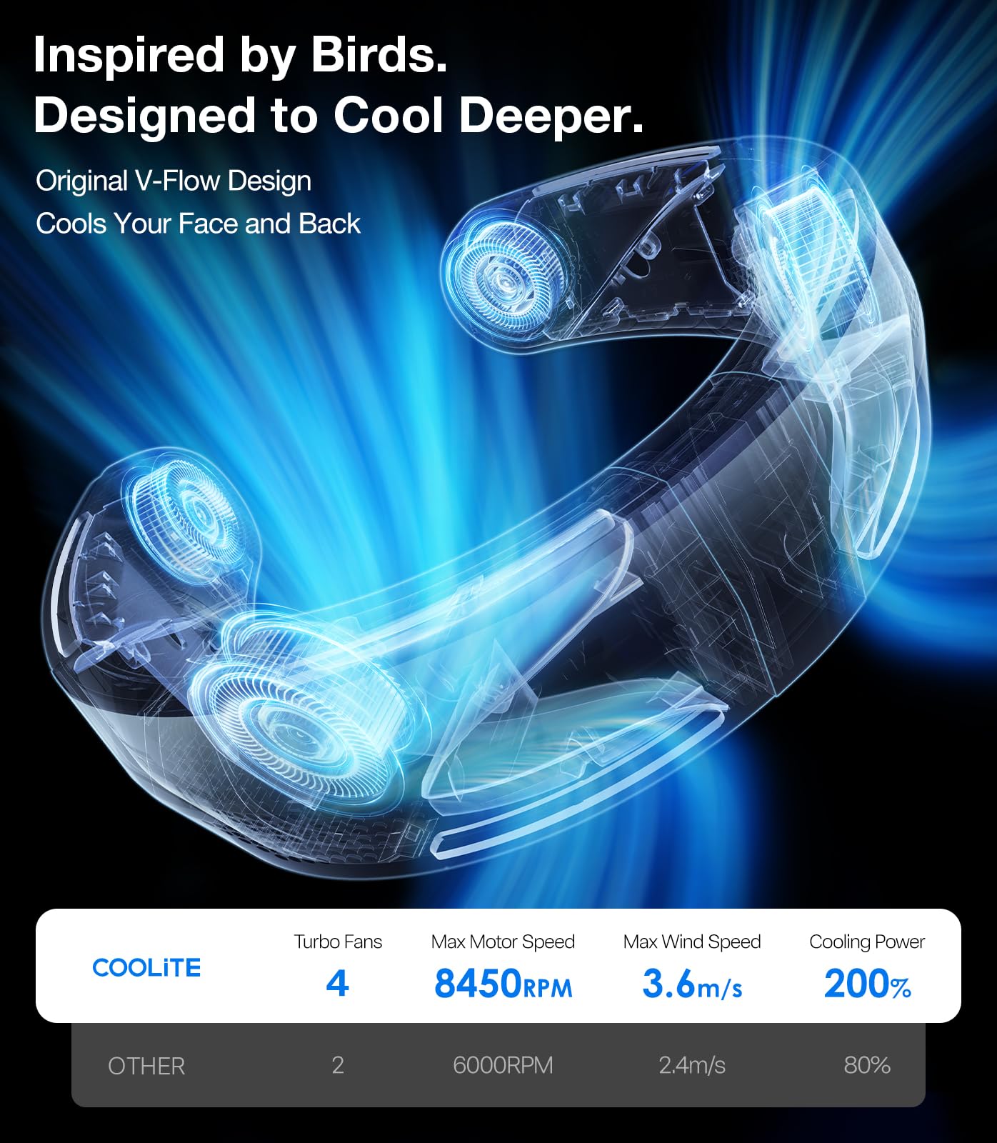 - [What makes the COOLiTE neck fan's cooling so powerful?] 2025 COOLiTE neck fan uses innovative 4-turbo wind fans design and patented airflow compression technology, delivering 8450r/min ultra-high speed and 22ft./s gale. With 6 hill-type air ducts in two directions (up and down), COOLiTE brings 360° airflow around your face, neck and back, enabling cooling of your whole body. In just 3 seconds, feel a temperature drop of up to 15°F, making it perfect for stifling offices, scorching car interiors and outdoor activities