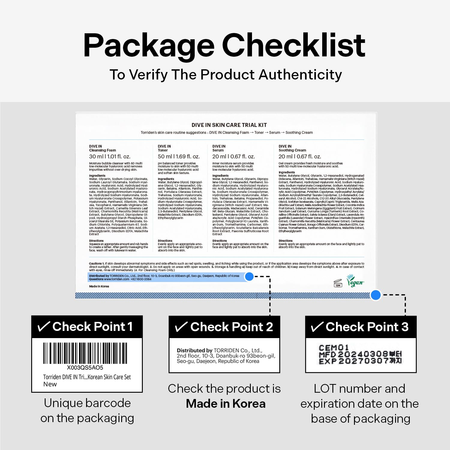 Torriden DIVE IN Trial Kit | Hyaluronic Acid Infused Daily Skincare Kit - 4 Step Regimen with Foam Cleanser, Facial Toner, Serum, and Cream | Korean Skin Care Travel Kit, Travel Essential