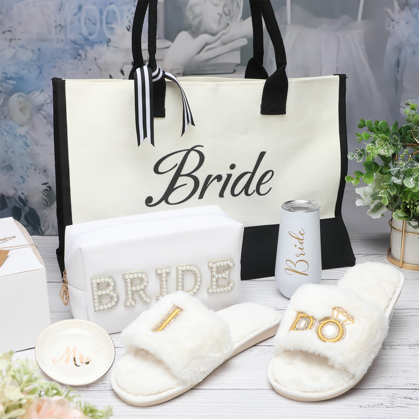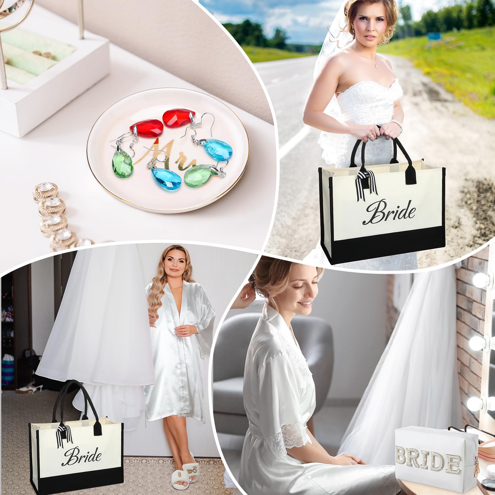 - Nice Combination: you will receive 1 piece of bride cosmetic bag, 1 piece of white robe, 1 piece of bride tote bag, 1 pair of slippers, 1 piece of small ring dish and 1 piece of wife tumbler; Ample quantities and convenient combinations are able to fully meet your gift giving needs to the bride for engagement parties
