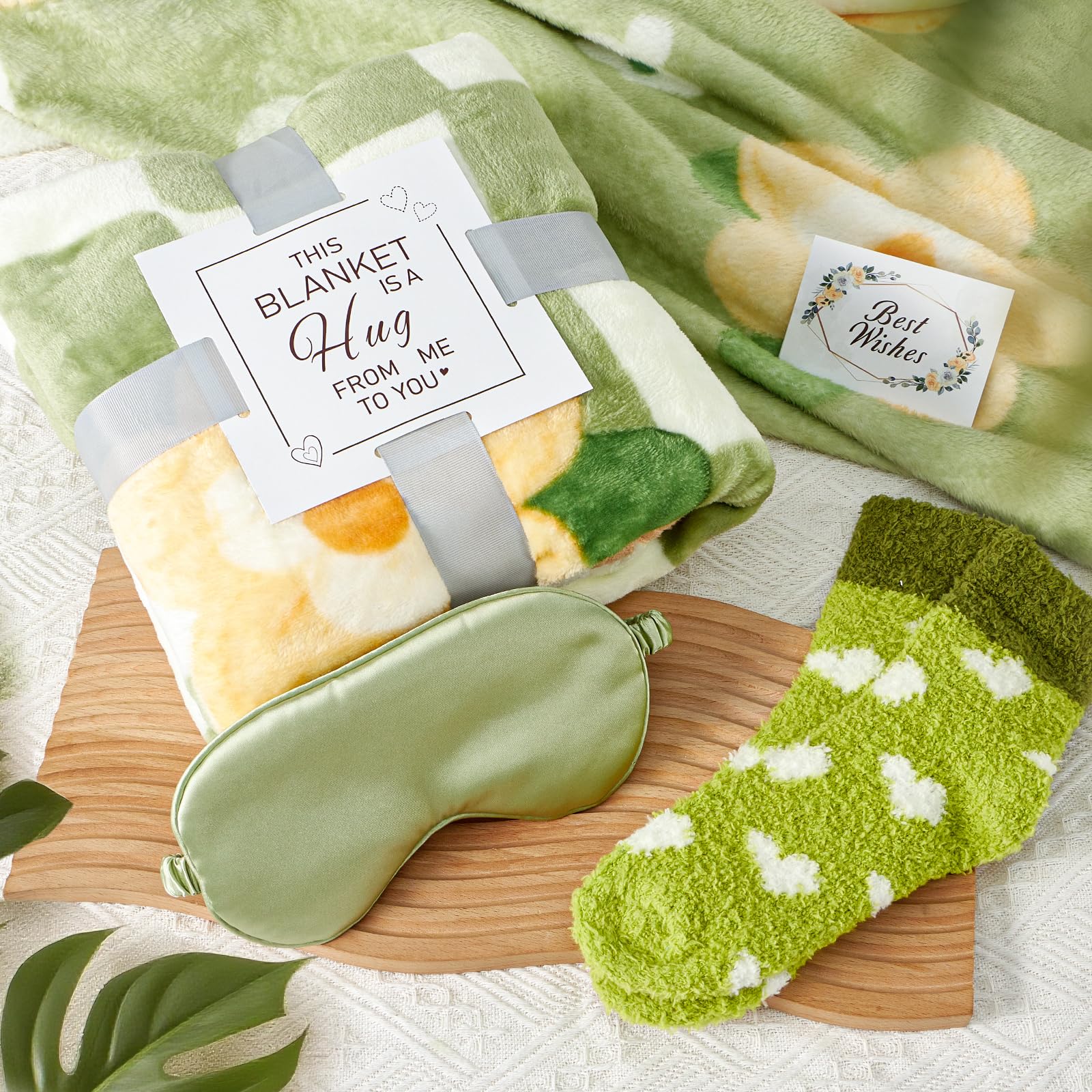 - Comfort Touch: Wrap her in softness with the plush green blanket—lightweight yet warm, perfect for cozy evenings. The fuzzy socks with white hearts add a cute, comforting touch. The silk sleep mask is light as air, with a smooth, silky texture that blocks out light for true relaxation. Ideal as a surgery recovery gift for women, or a get well soon gift for women who needs both physical and emotional rest. The included card with the words “A Hug from Me to You” delivers a loving message without saying a word.