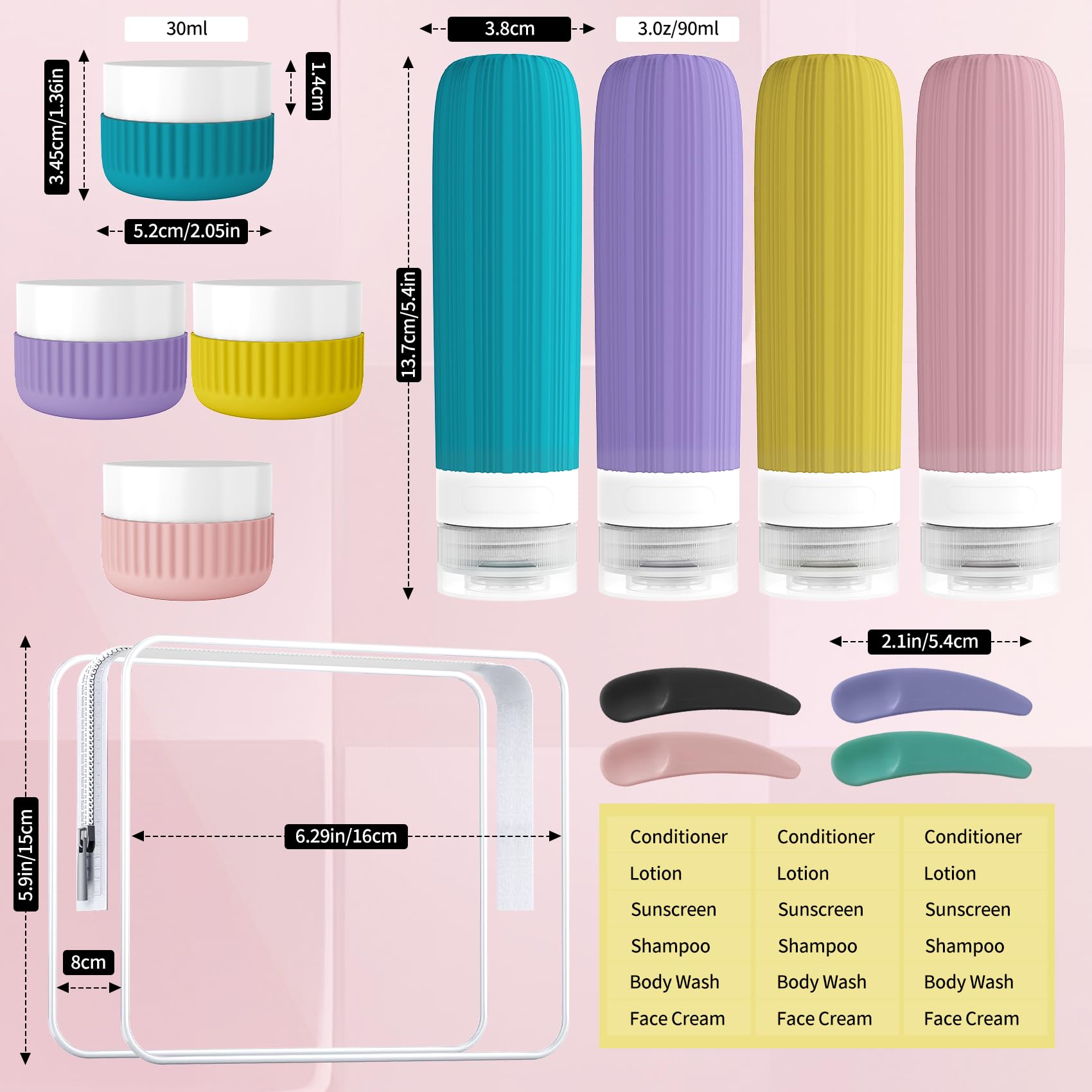 - 【TRAVEL TOILETRIES CONTAINER】This Travel Set includes 4 silicone travel bottles, 4 silicone travel jars, 4 spoons, 1 printed label, and 1 clear zipper bag. It offers different accessories for your needs