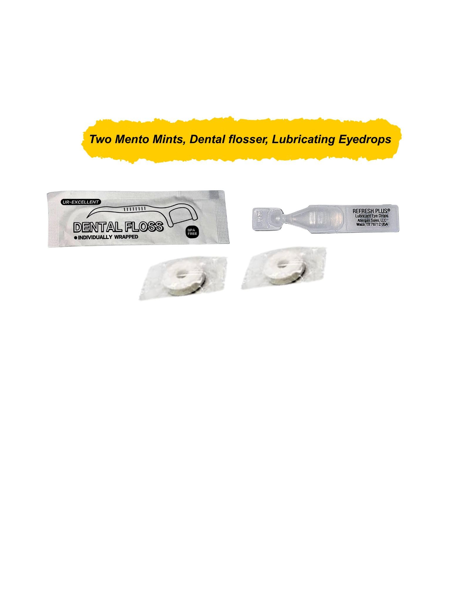 - Complete on-the-go kit with 9 essentials for travel, work, or daily life. Stay prepared whether you're flying, driving, or commuting. TSA-friendly and compact pouch fits easily in carry-ons, backpacks, purses, or glove compartments. Perfect for frequent travelers. Kit includes a stain remover wipe, ear plugs, vitamin C packet, wipes, eye drops, dental flosser, pain relief and 2 mints. Simple, useful, and gift-ready.