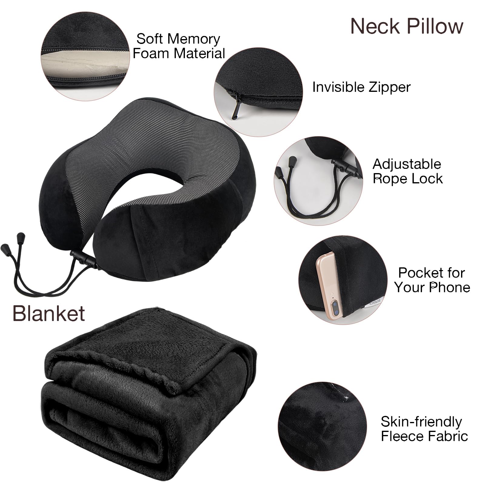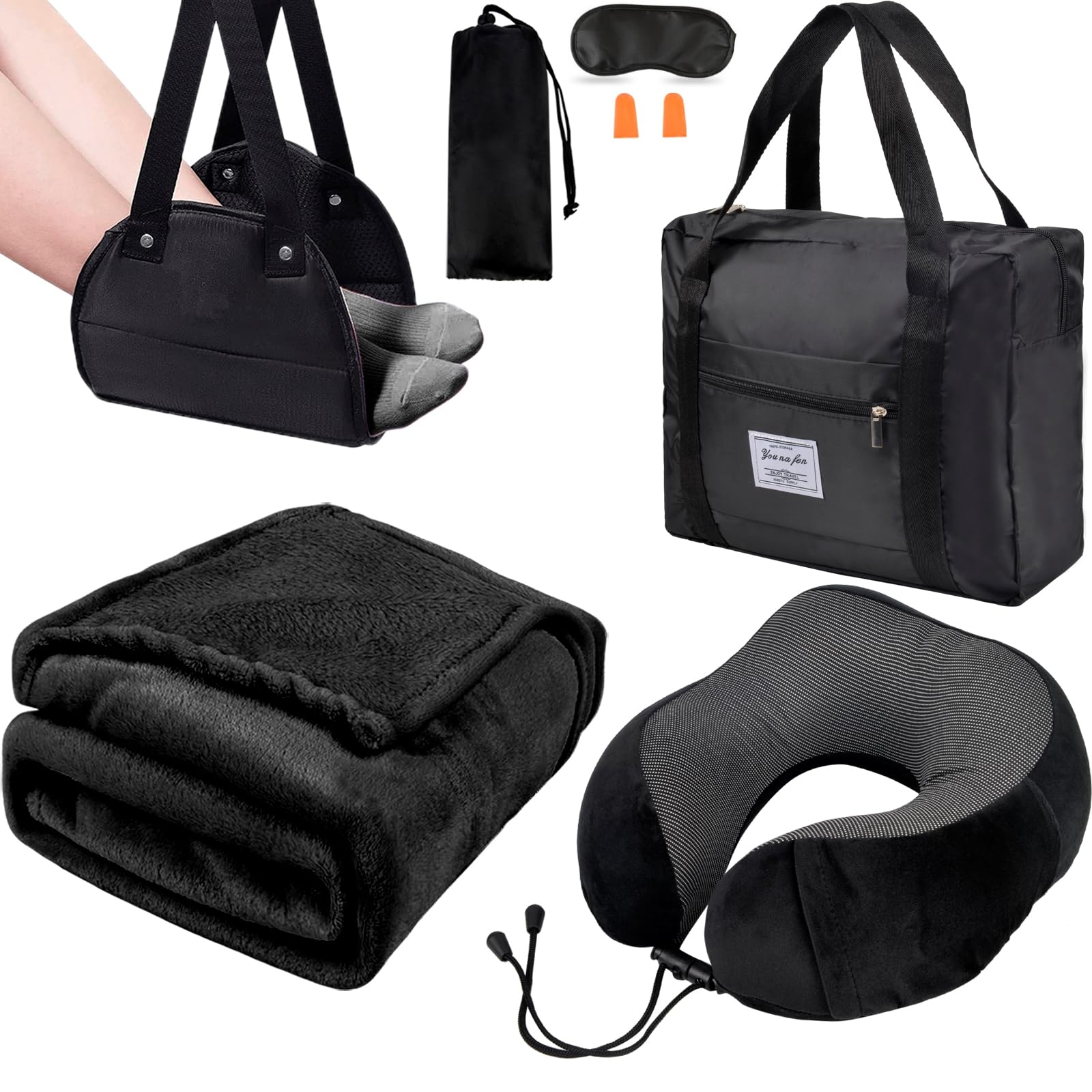- ✈Black Travel Pillow and Blanket Set - The Nerien travel blanket and pillow set includes a duffel bag, memory foam neck pillow, eye mask, earplugs, fleece blanket, and a airplane foot hammock with a storage bag. This premium airplane travel kit has everything for a relaxing and peaceful journey, ensuring you arrive at your destination refreshed and energized. It's a must-have for seasoned travelers everywhere as airplane travel essentials.