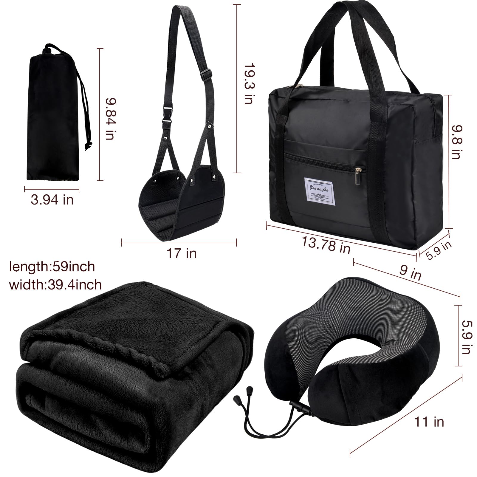 Travel Pillow and Blanket Set & Foot Rest, Memory Foam Neck Pillow Airplane Blanket & Airplane Foot Hammock & Foldable Duffel Bag, Eye Mask & Earplugs, Portable Travel Accessories Essentials, Black
