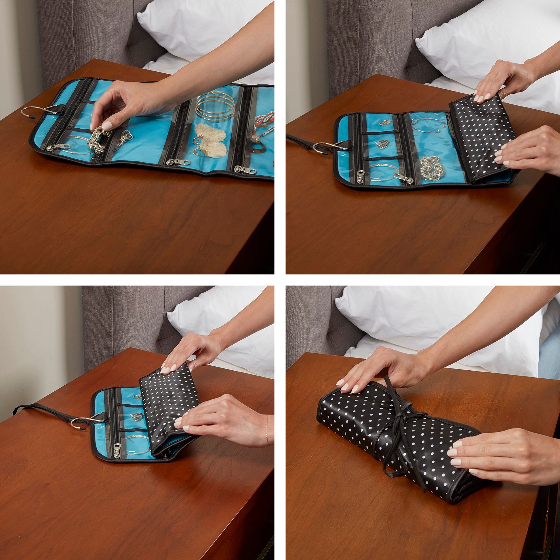 - Roll Bag with Six Zippered Pockets: 11.5 D x 5.5 W x 16.5 H inches, with three large zippered pockets for necklaces and bracelets, and three small zippered pockets for rings and earrings, making it the perfect travel storage for your jewelry