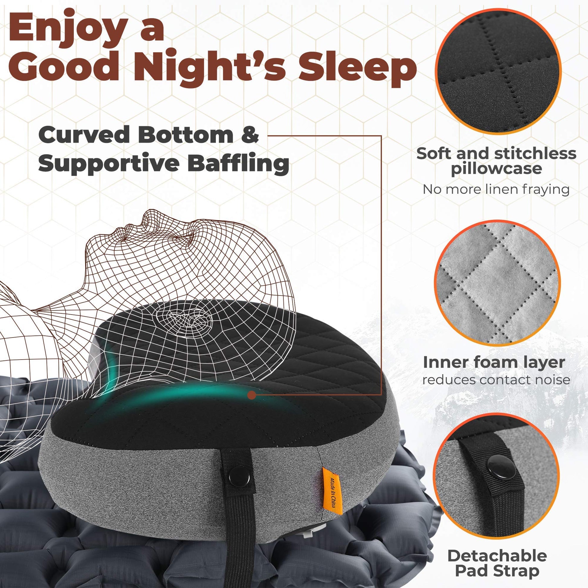 - Curved bottom and Supportive Baffling - This backpacking pillow providing great support for head and neck, ergonomic for sleeping. Also useful as a lumbar support pillow for back support. This Aluft Deluxe Pillow is the dream gear for every camper and backpacker