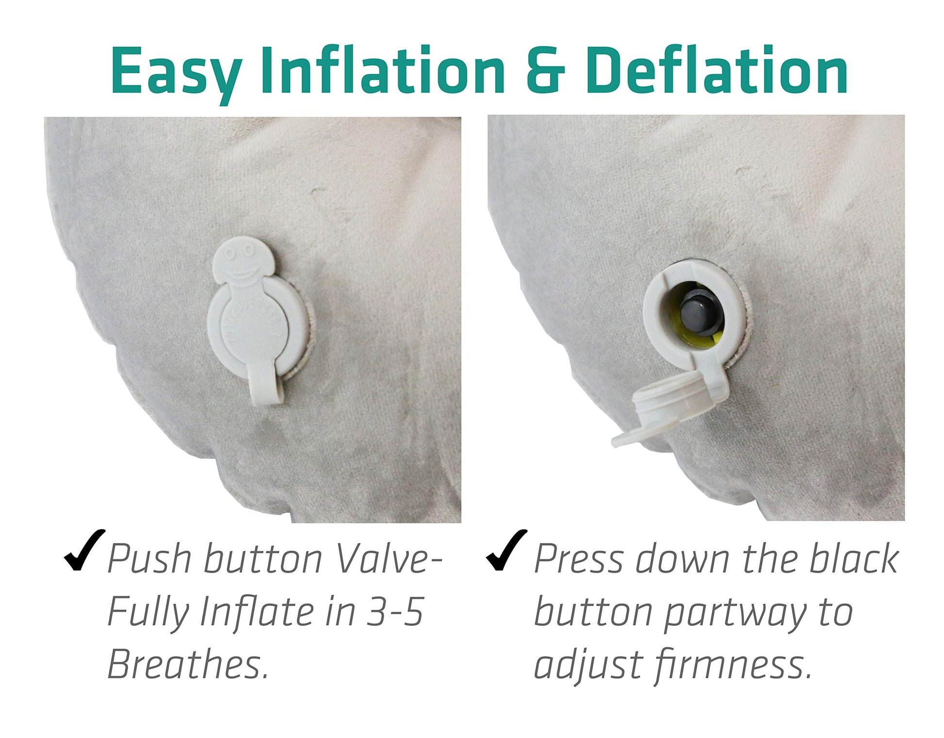 - ✅ FAST INFLATION WITH BUTTON & QUICK DEFLATE – Inflate this inflatable neck pillow for travel in just 3–5 breaths using the built-in button pump—no more blowing into awkward nozzles. Once you're done, the quick deflate valve feature lets out the air instantly, saving you time and hassle.