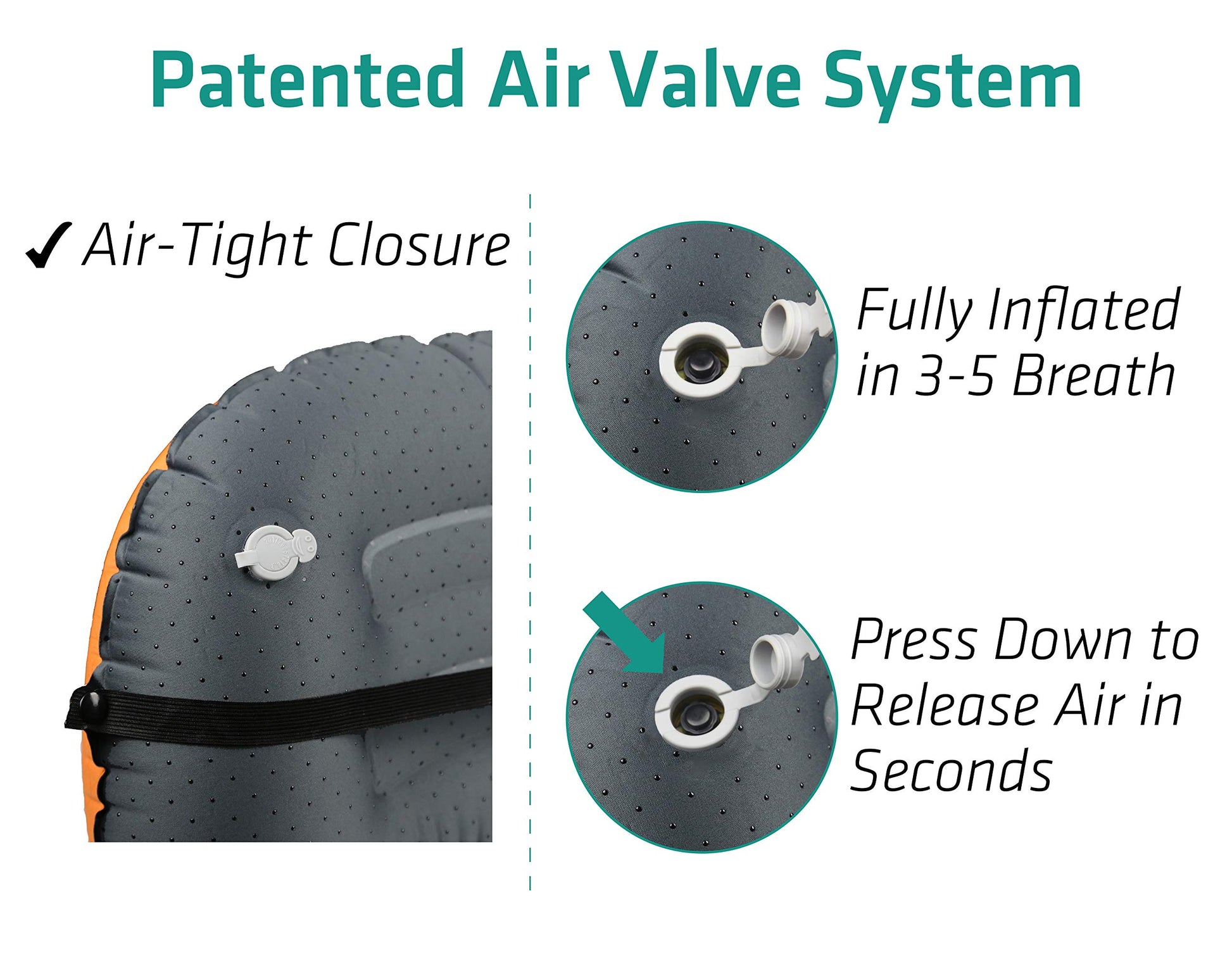 - Ease Of Use! With the simple click of a button, Inflate pillow by mouth with approximately 5-8 breaths. Once you are done you can conveniently deflate the pillow with the Quick Deflate feature which rapidly releases air after use in only seconds. With the unique technology in this compact and light pillow, you are able to adjust firmness to your personal sleep preference. You can Rest easy with our 100% Satisfaction Guarantee!