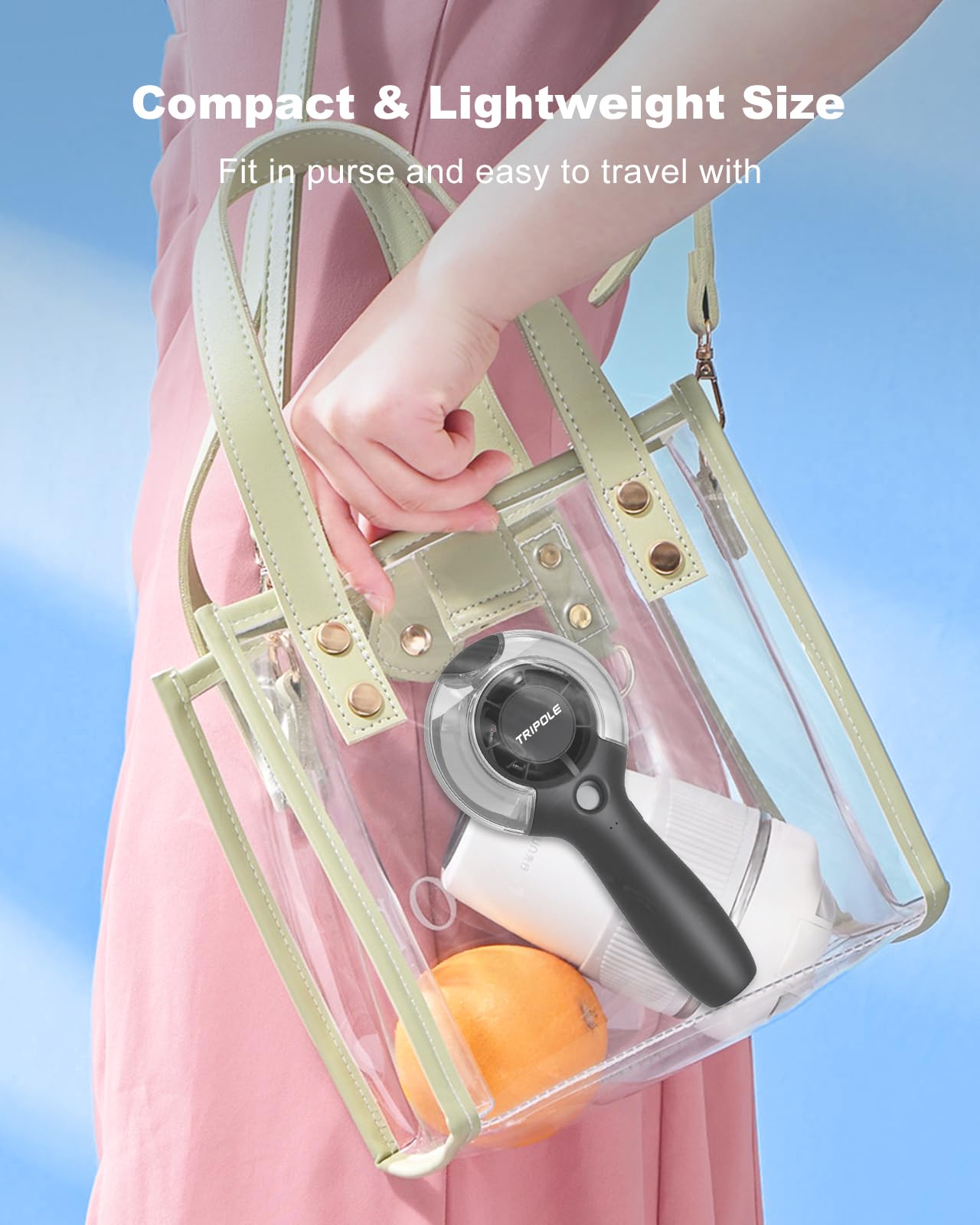 - Compact Size to Carry: TriPole spray bottle fan is only 7” long, small enough to put in purse or travel bag. The rubber lid is wide and tight to ensure no water leaking. Take this small fan during trip, park, concerts, beach, etc, you will enjoy hydrated and cool instead of stuffy air