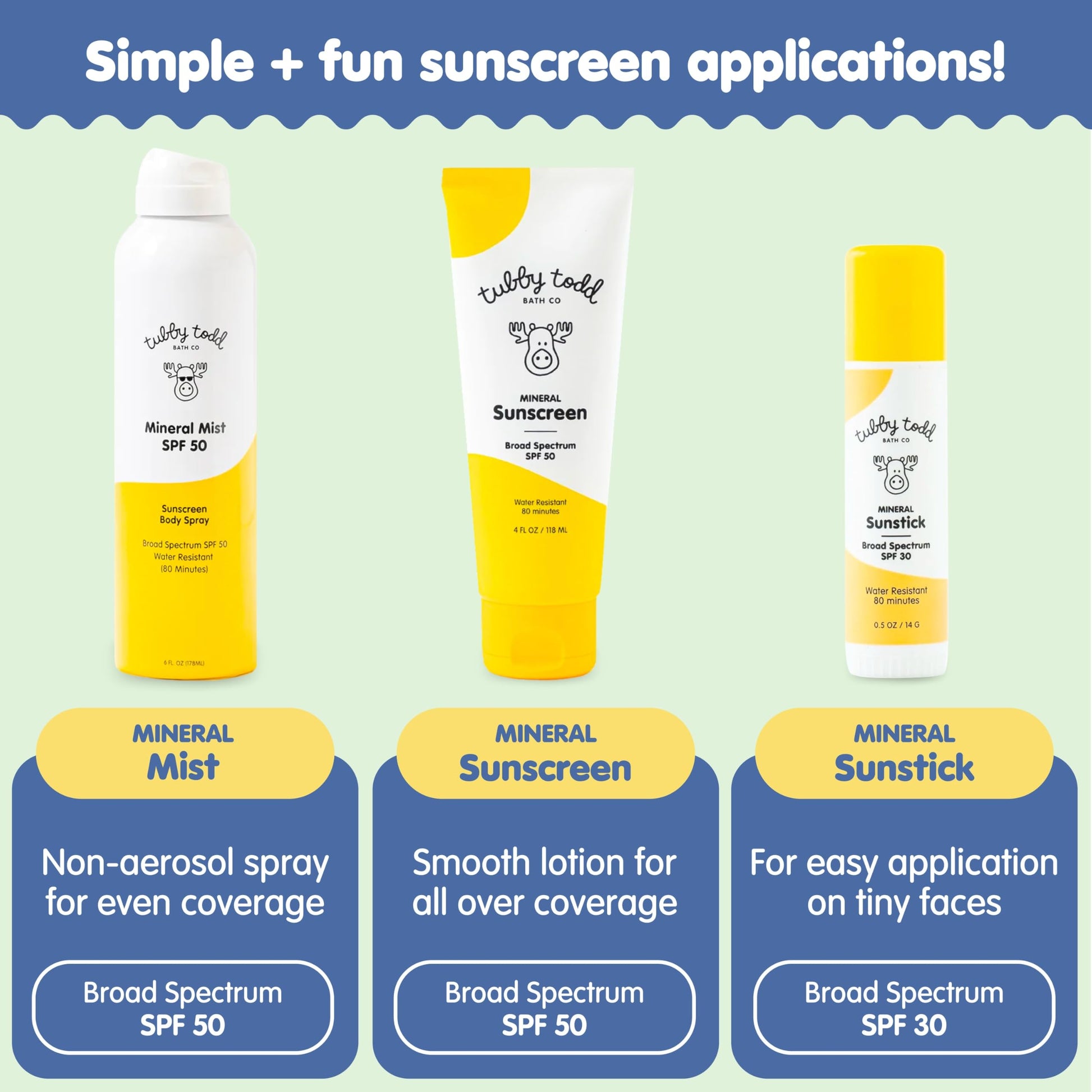 Tubby Todd Face and Body Mineral Protection Sunscreen Kit for Baby, Toddler and Kids - The Sun Bundle - Sunscreen Lotion 4 Fl Oz, Sunscreen Spray 6 Fl Oz and Sunstick 0.5 Oz - Fragrance-Free