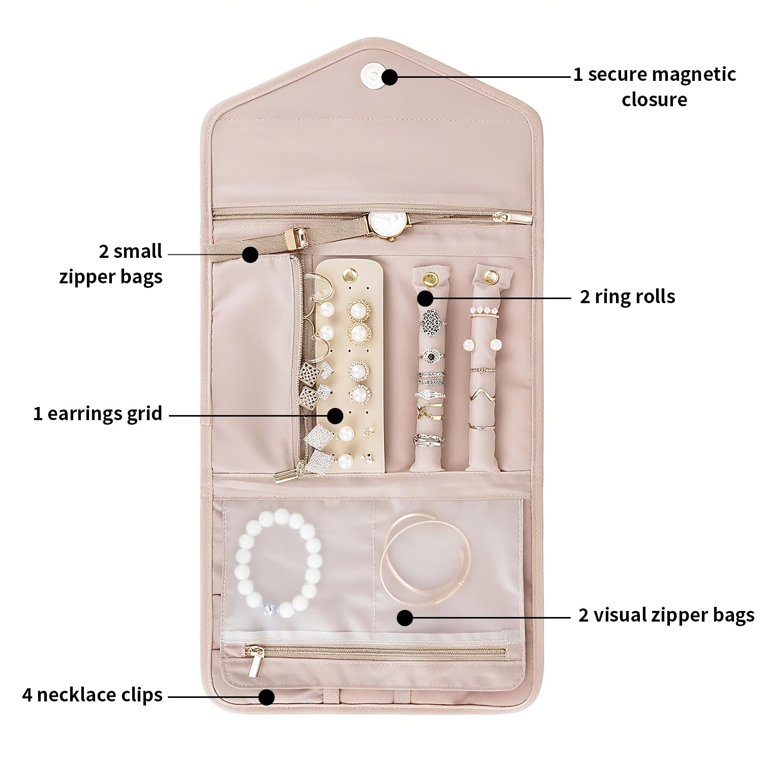 TxufrDo Travel Jewelry Case Organizer Roll Foldable Jewelry Case for Journey-Rings Necklaces Earrings Bracelets Brooches Portable Travel Essentials Pink