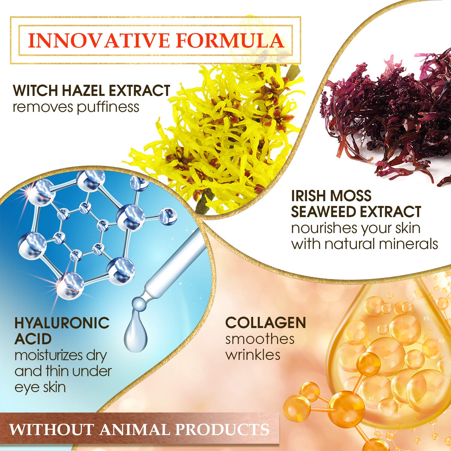 ✔ IRISH MOSS SEAWEED EXTRACT in our puffy eyes treatment pads nourishes, increases the elasticity and stimulates cell regeneration process.