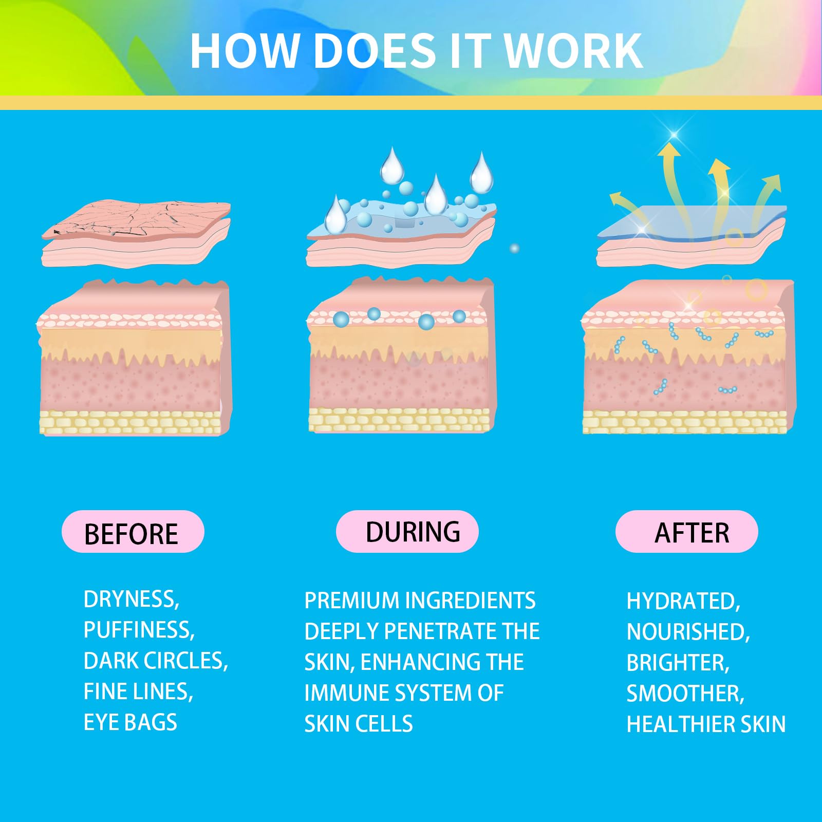 - How to Use: Clean your face with warm water and dry it. Take out a pair of patches and follow these steps: (1) Press the mask onto your skin, ensuring there is no air between your skin and the mask. The mask might slide when first applied due to the essence. (2) Please hold the mask for about 1 minute initially, allowing your skin to absorb the essence or you can remove excess essence directly. The eye mask will adhere well. Wait around 20 minutes to let your skin absorb the premium ingredients.