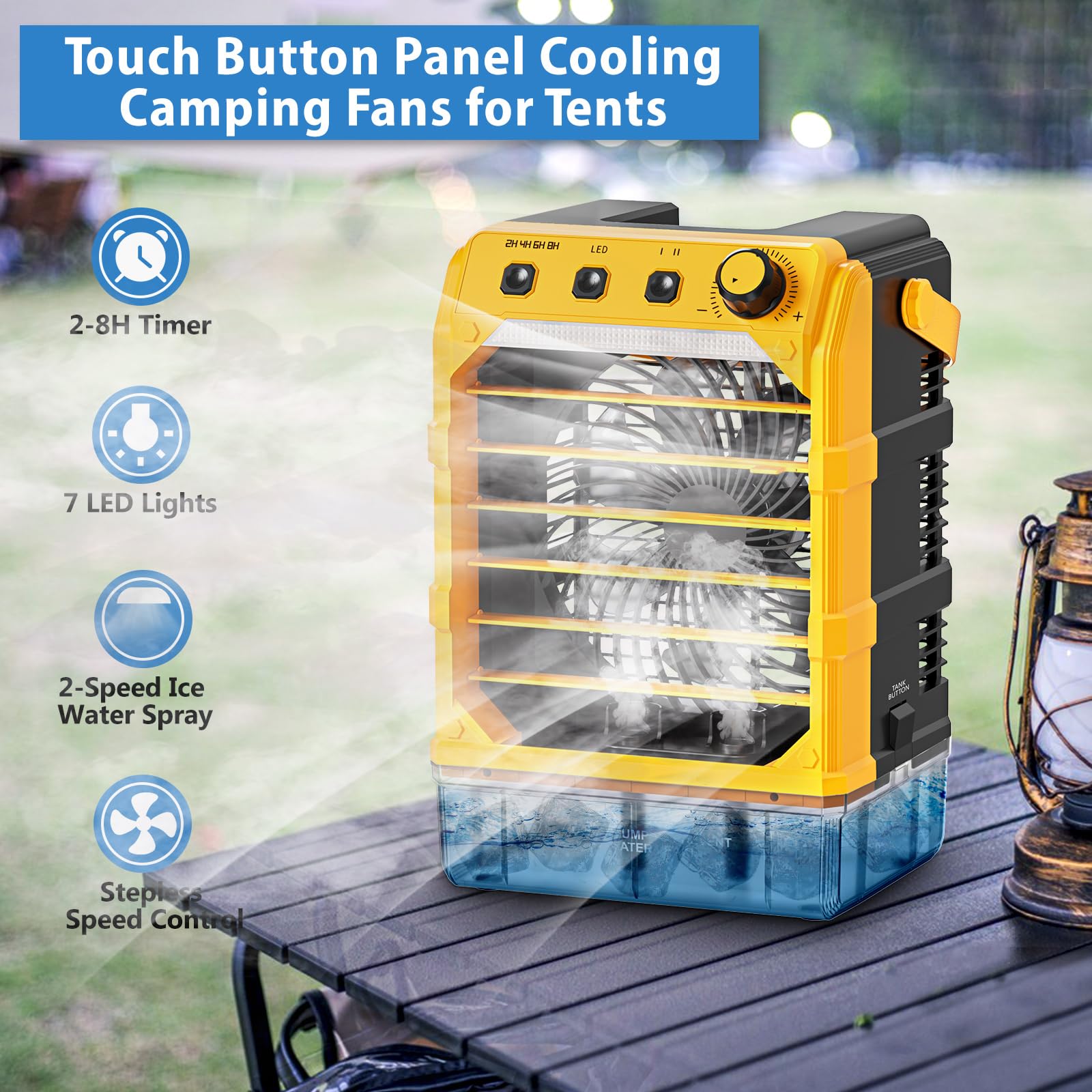 - Customized Comfort: Camping fans for tents have a large 1600ml water tank, two sprayers, stepless speed control; Water misters for cooling outdoor adjust the wind speed and spray to your like; 7 color lights, 2/6/8 hours timer and low-noise operation for distraction-free comfort