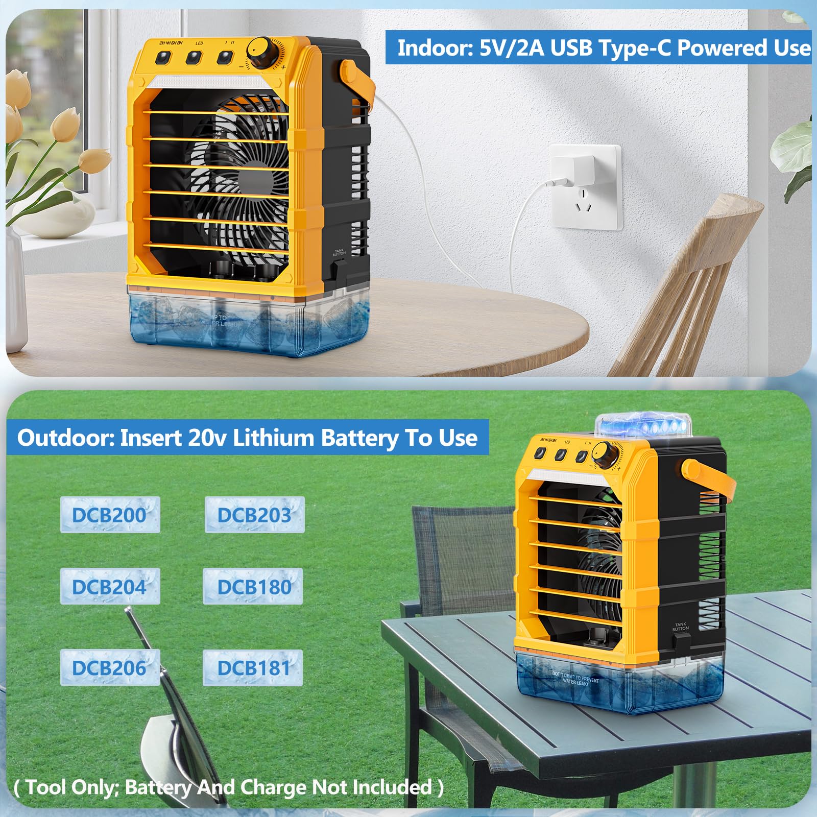 - Camping Fan Battery Powered: Uniqwamo battery powered fan compatible for Dewalt 20v Battery(battery not included), portable fan with mist work for DCB200, DCB203, DCB204, DCB207, DCB206, DCB181, DCB182, great for outdoor activities, ensuring cool comfort wherever you go