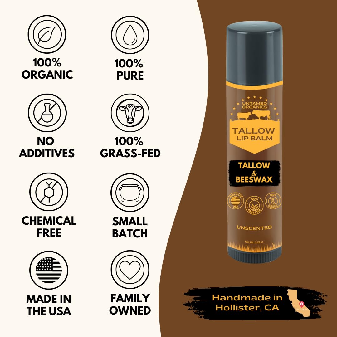 Untamed Organics Pure Tallow Lip Balm | 100% Grass-Fed Beef Tallow and Organic Beeswax | Moisturizing Lip Care for Dry, Chapped Lips | Hypoallergenic, Fragrance-Free | Handcrafted in USA | 4-Pack