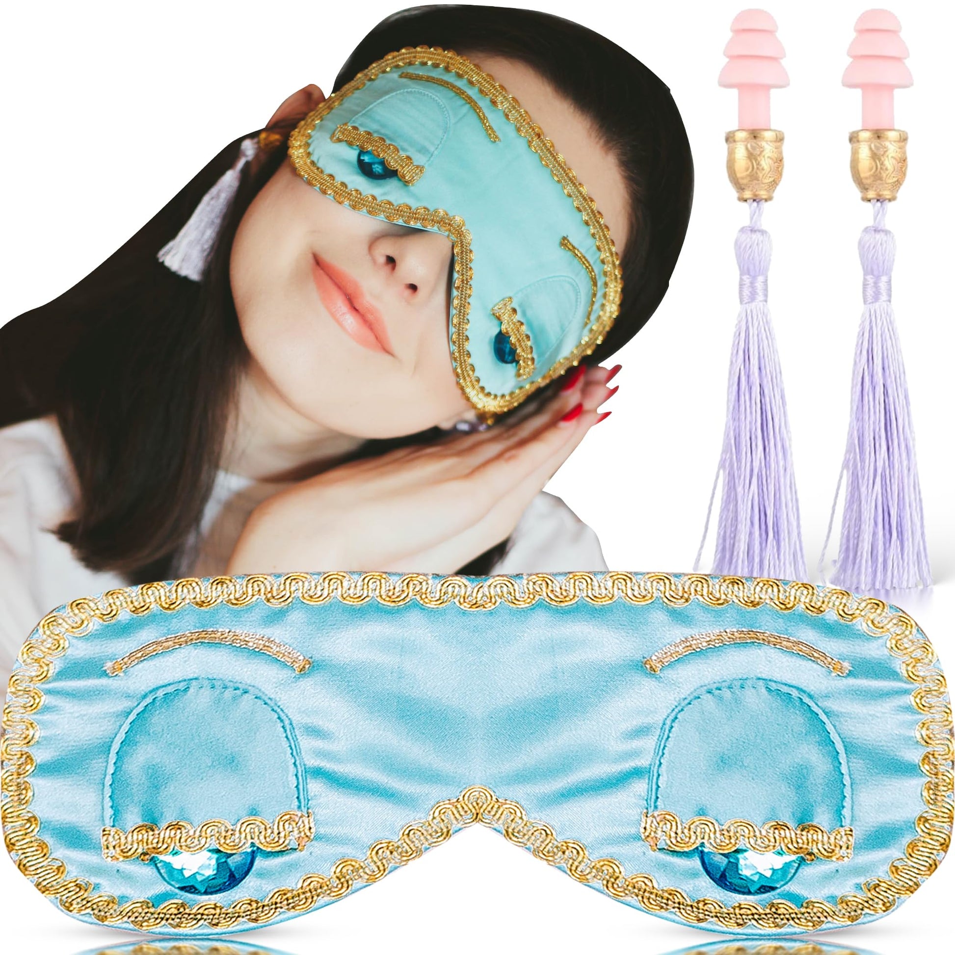 - ๐๐จ๐ฆ๐ฉ๐ฅ๐๐ญ๐ ๐๐ฅ๐๐๐ฉ ๐๐จ๐ฅ๐ฎ๐ญ๐ข๐จ๐ง. Includes comfortable Lavender tassel noise-reducing ear plugs and a blue silk sleep mask to ensure a peaceful sleep environment, whether you're at home, traveling, or just needing some quiet time. The eye mask is 8.5" across the face with a 16.3" adjustable gold elastic tie and the tassel earplugs measure at 4" of sheer glam and beauty.