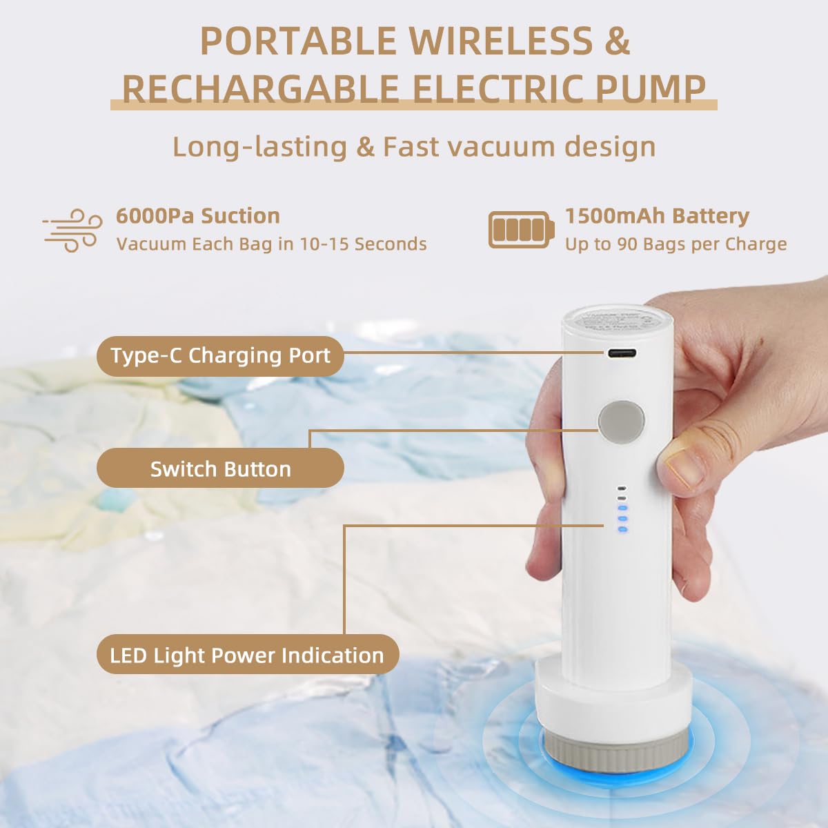 - 【Powerful Electric Pump & Cordless Design】: Our rechargeable mini electric pump delivers impressive 4000Pa suction, condensing your items in seconds. The built-in 1500mAh battery allows you to compress up to 90 bags on a single charge, making it a true travel essential for vacations, cruises, and long-distance flights. Forget manual pumps and save valuable time and energy for your trip.