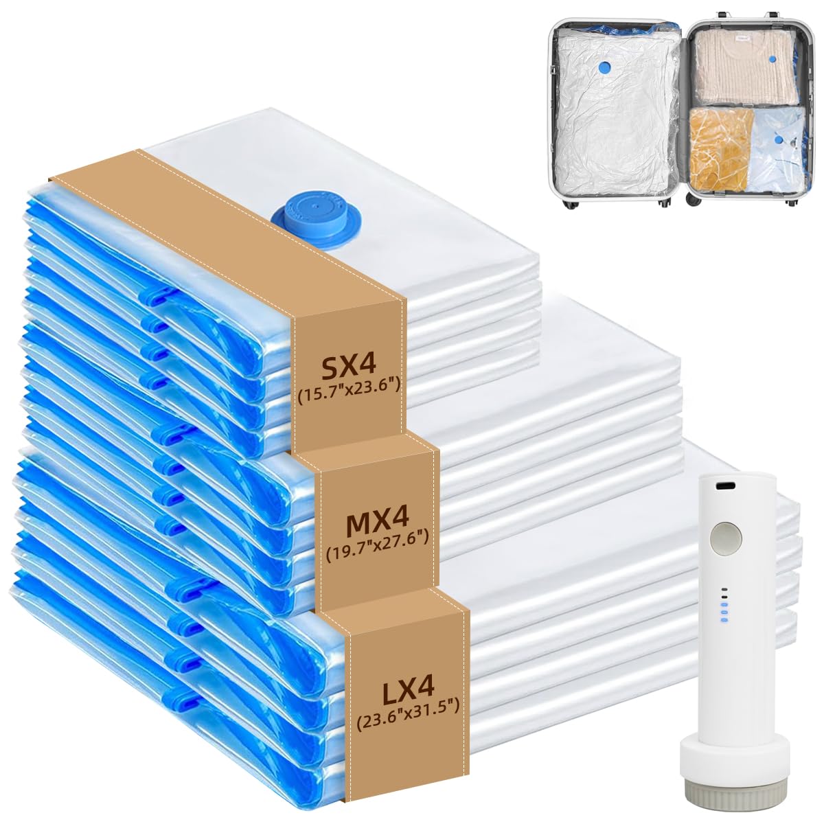 Vacuum Seal Bags with Portable Electric Pump, 12 Pack Vacuum Storage Bags for Clothing Travel, Compression Packing Space Saver Bags for Luggage Suitcase (4 Small & 4 Medium & 4 Large)