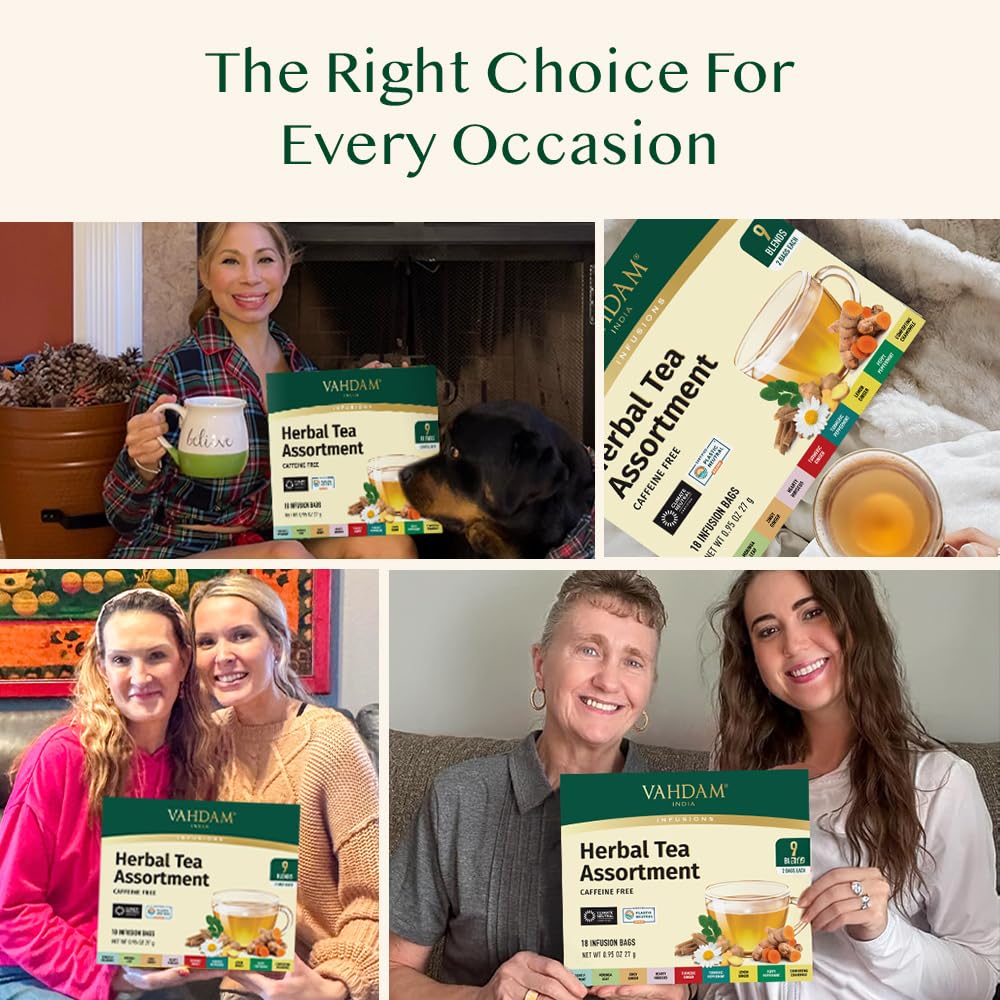 VAHDAM, Assorted Herbal Tea Sampler (18 Tea Bags, 9 Flavors) Caffeine-Free, Non-GMO | Double Infusion, Individually Enveloped Tea Bags | Herbal Tea Assortment