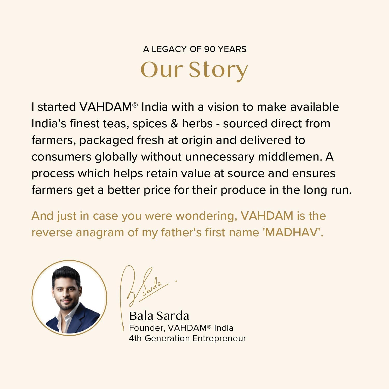 - A BRAND WITH A BILLION DREAMS - VAHDAM India is one of India's largest digitally native, global brands, shipping to over 3 million customers across 130+ countries. With an aim to bring India's finest Teas, Brew Ware, Spices & Herbs to consumers across the world under a home-grown, sustainable label with a strong commitment to people and planet.
