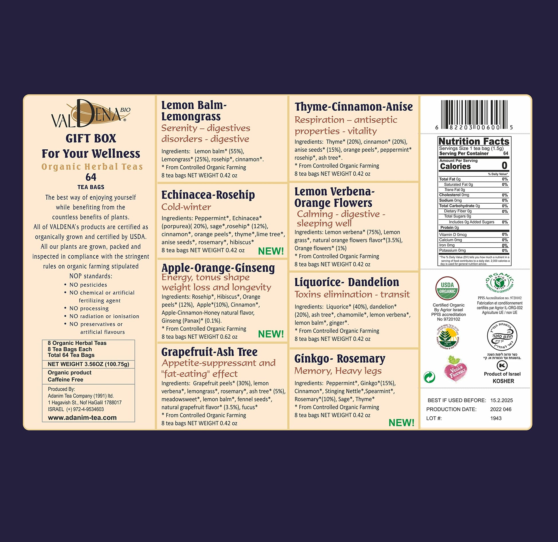 Valdena Bio Organic Herbal Tea Variety Pack, Tea Sampler Gift Set Box, 8 Flavors Assorted Tea, Total of 64 Tea Bags, Caffeine Free Tea Set with Variety of Health Benefits