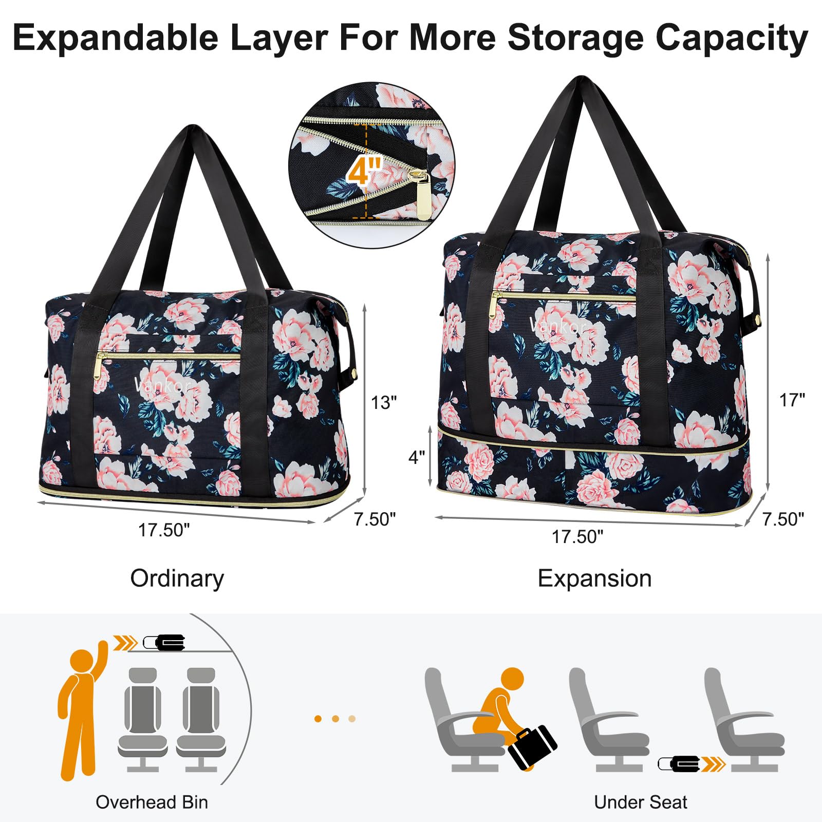 Vankor Expandable Travel Duffle Bag for Travel, Foldable Carry on Tote Bag Lightweight Weekender Overnight Hosptital Bag for Men Women Black Floral