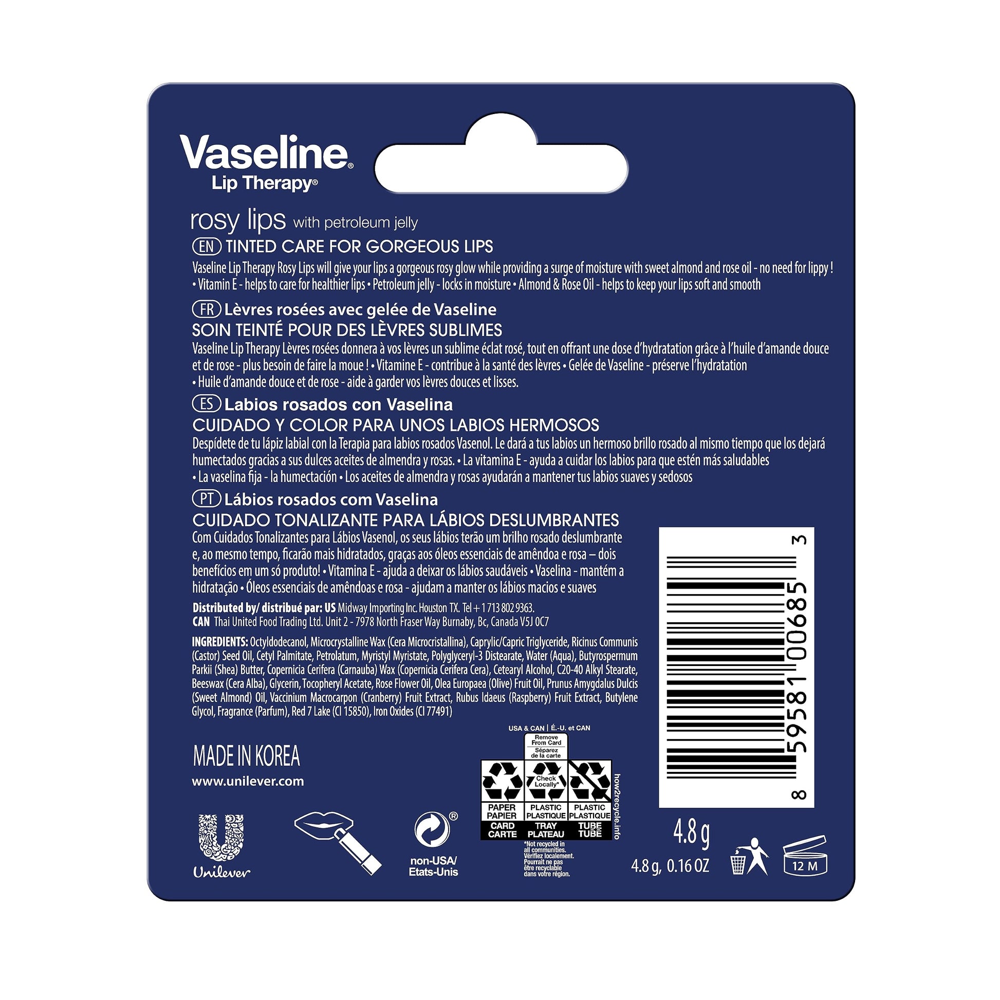 - Soothes and Hydrates: Vaseline Lip Therapy, tinted care for gorgeous lips. With a hint of Almond and Rose Oil, it soothes and softens leaving your lips feeling hydrated while providing a slight rosy glow.