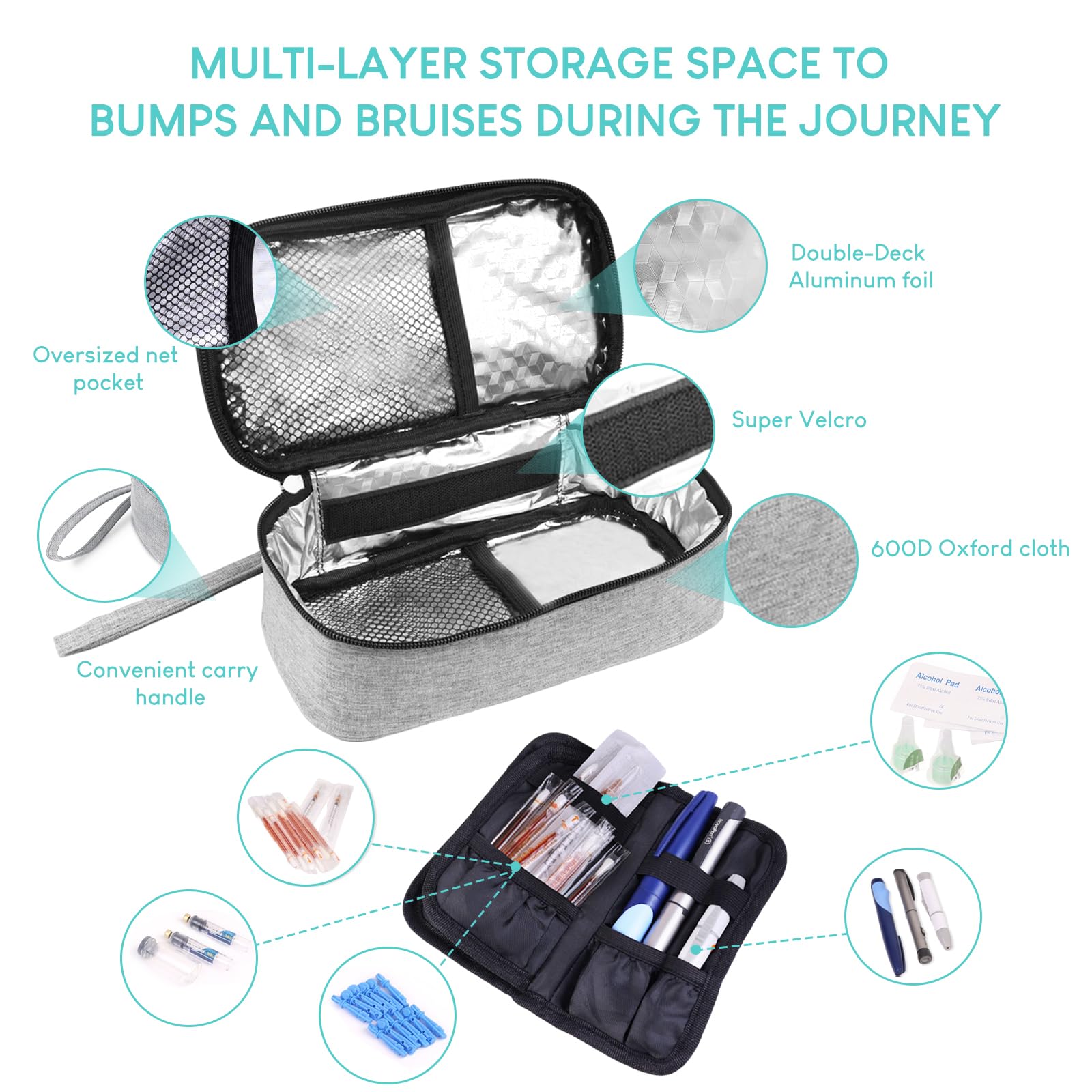 - 【Easy to Carry】Insulated Organizer Cooling Bag size: 9*4.7*3 inches, net weight about 6.5 oz, compact and lightweight, portable and easy to carry for traveling, camping, office or school. No more hassle to find your medical supplies in the messy luggage.