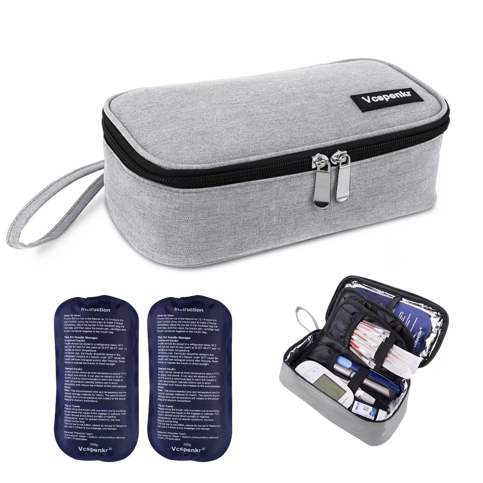 Vcspenkr Insulin Cooler Travel Case, Diabetic Medicine Carrying Bag with 2 * 200g Ice Packs, Large Capacity Insulated Organizer Medication Cooler Bag for Insulin Pens and Diabetes (Gray)