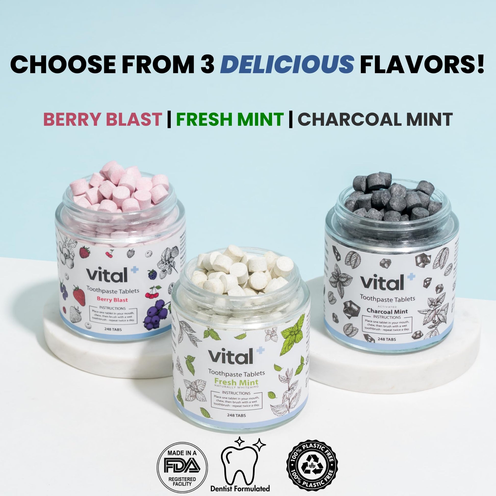 Vital Toothpaste Tabs with 7% Nano-Hydroxyapatite | Naturally Whitens + Remineralizes Teeth | Fluoride & Plastic Free | Combats Sensitivity | Travel & Eco Friendly | Fresh Mint | 62 Tablets (1 Month)