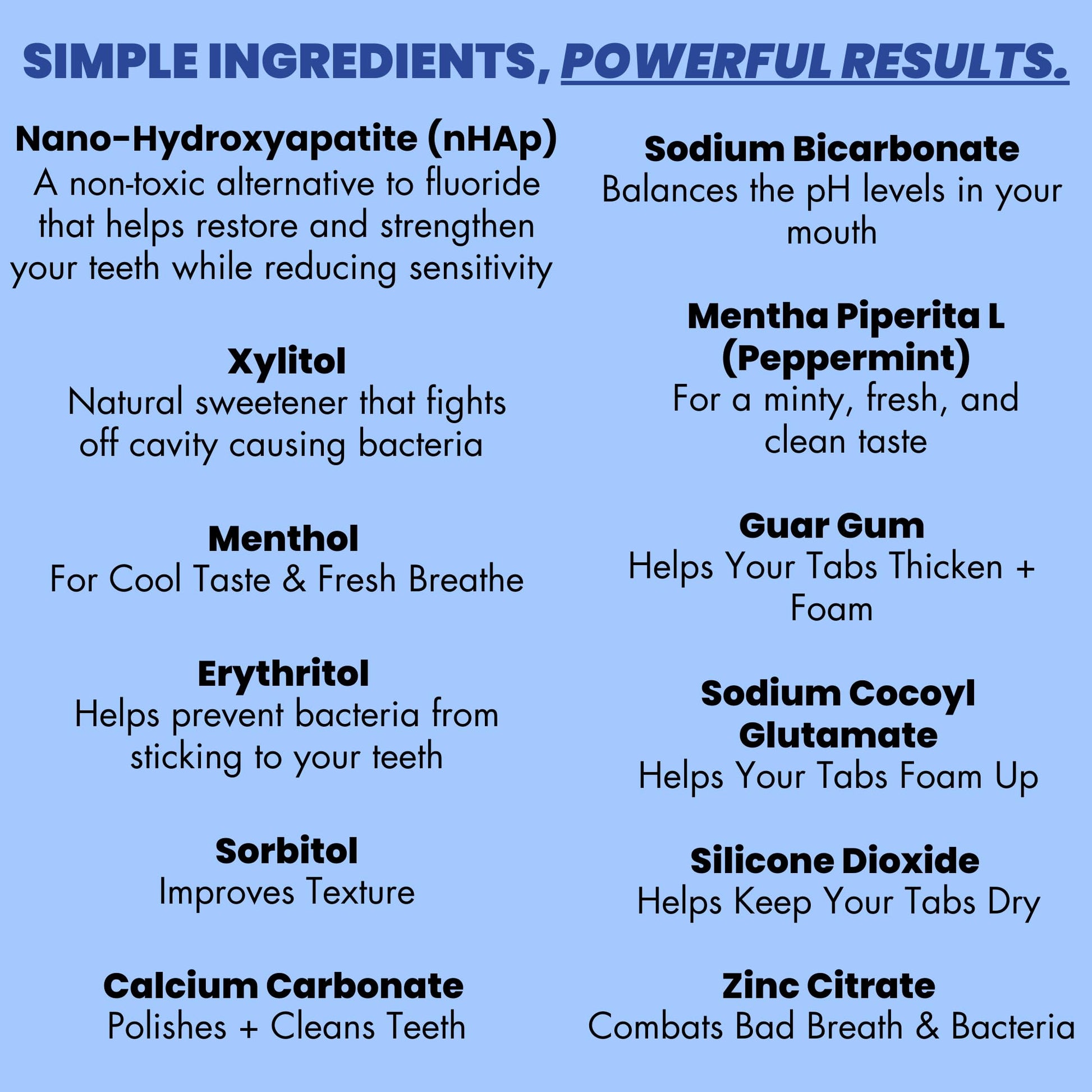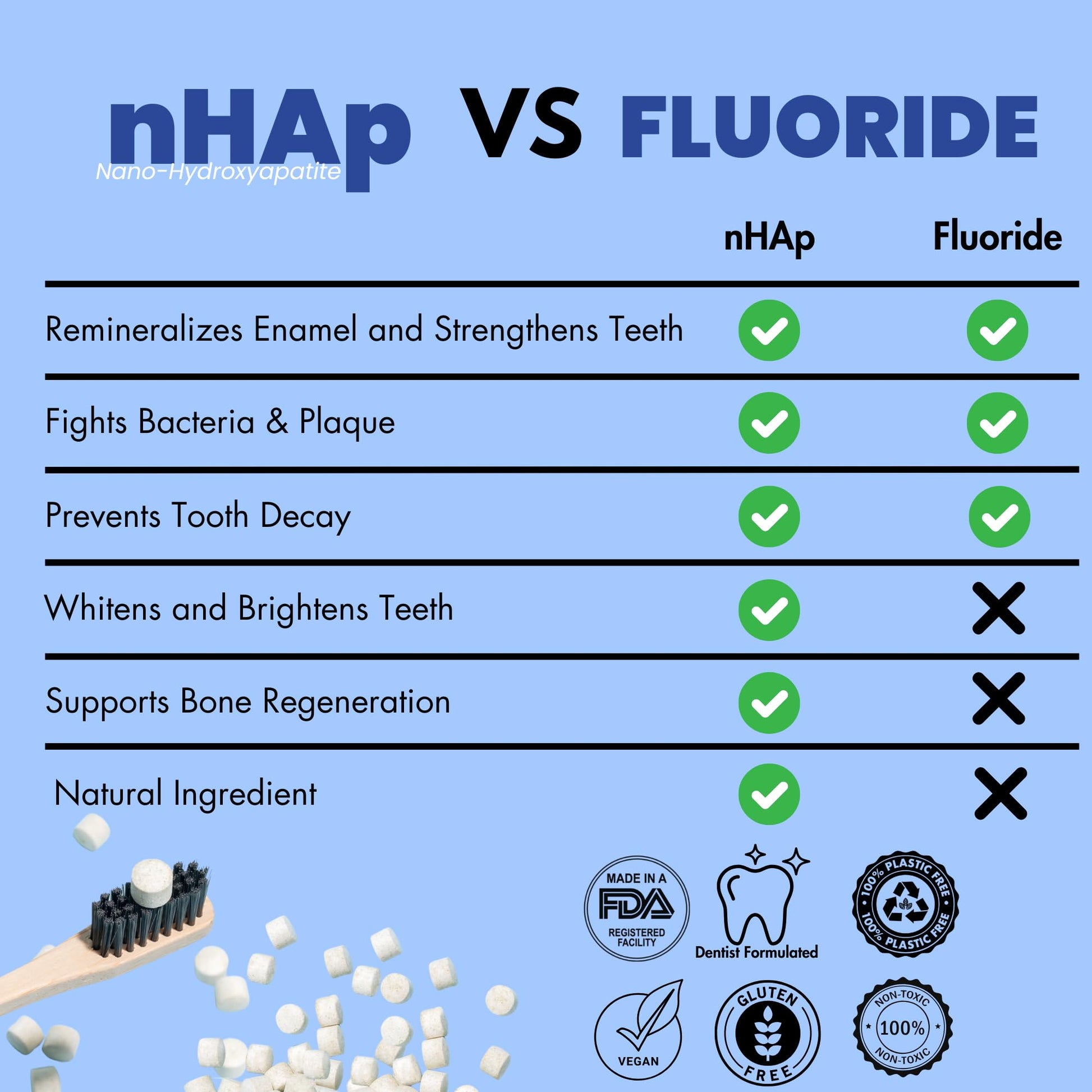- MADE WITH NANO-HYDROXYAPATITE (nHAp): All of our toothpaste tablets are formulated with a marvel in oral care known as Nano-Hydroxyapatite which is a non-toxic alternative to fluoride that helps restore and strengthen your teeth while reducing sensitivity. nHAp helps to remineralize your teeth, prevent decay, reduce sensitivity, and whiten!