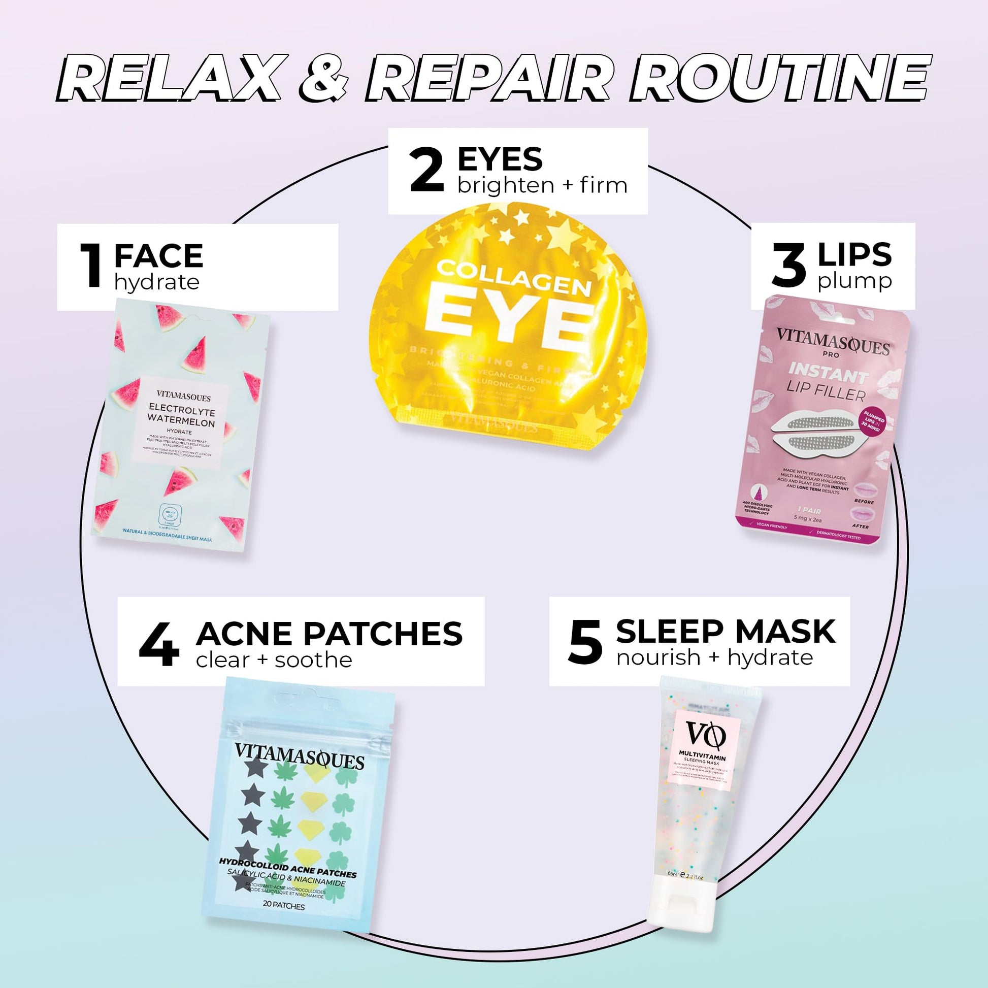 - Face Mask Pack for Skincare: Vitamasques Juicy face masks skincare set features 7 premium triple-layer sheet masks inspired by K-beauty. Includes: 1 Electrolyte Watermelon hydrating face mask, 1 Pineapple sheet face mask, 1 Niacinamide Blueberry facial mask, 1 Vitamin C Cherry sheet mask, 1 Vegan Collagen Lychee korean collagen face mask, 1 Retinol Pomegranate facial mask, and 1 Blackberry sheet mask.