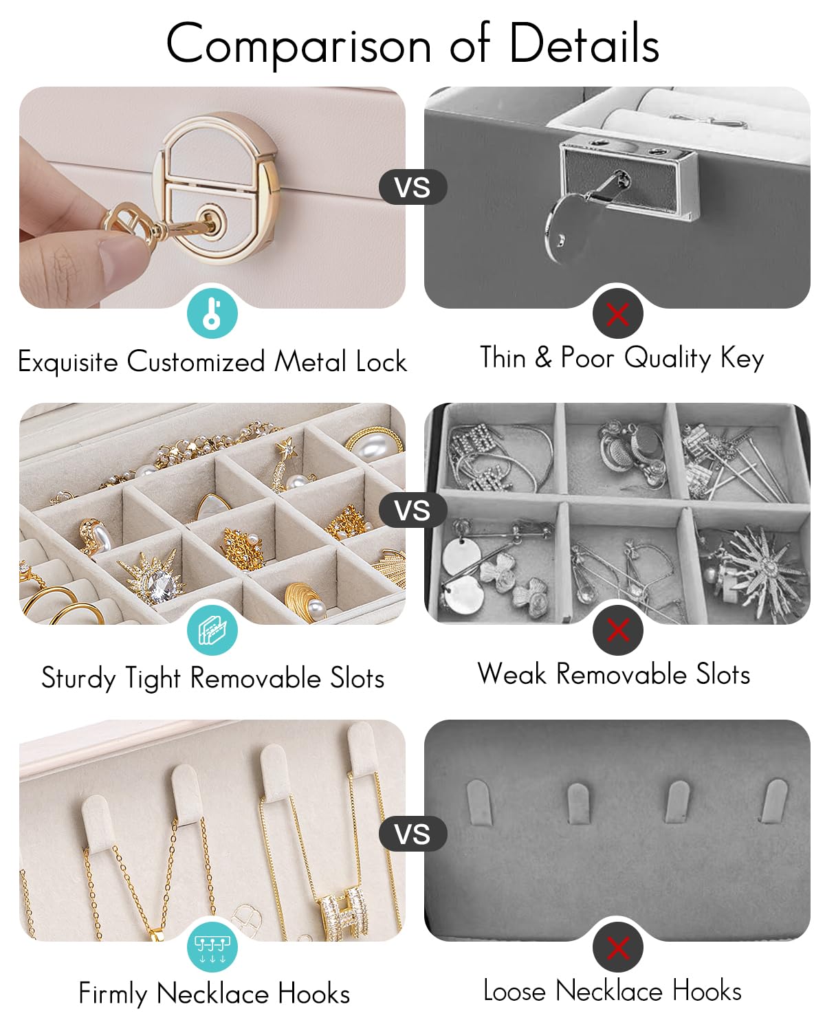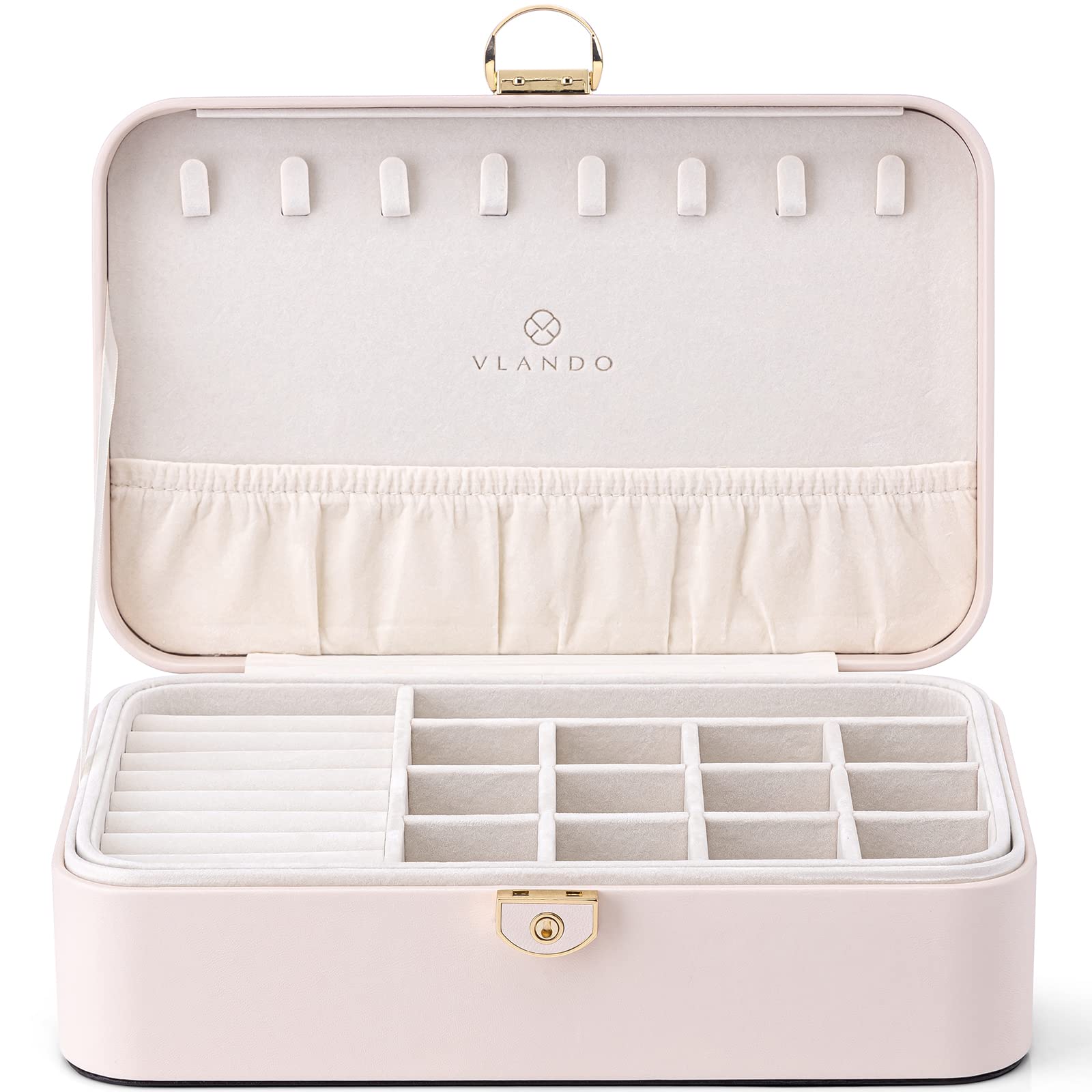 - Vlando jewelry box & organizer box is a 2 layer design, the first layer is suitable for storing rings, earrings, earrings, bracelets; the second layer is suitable for storing bracelets, ladies watches, brooches, souvenirs; the jewelry box lid has 8 necklace hooks and an elastic band to ensure that your necklace is not knotted