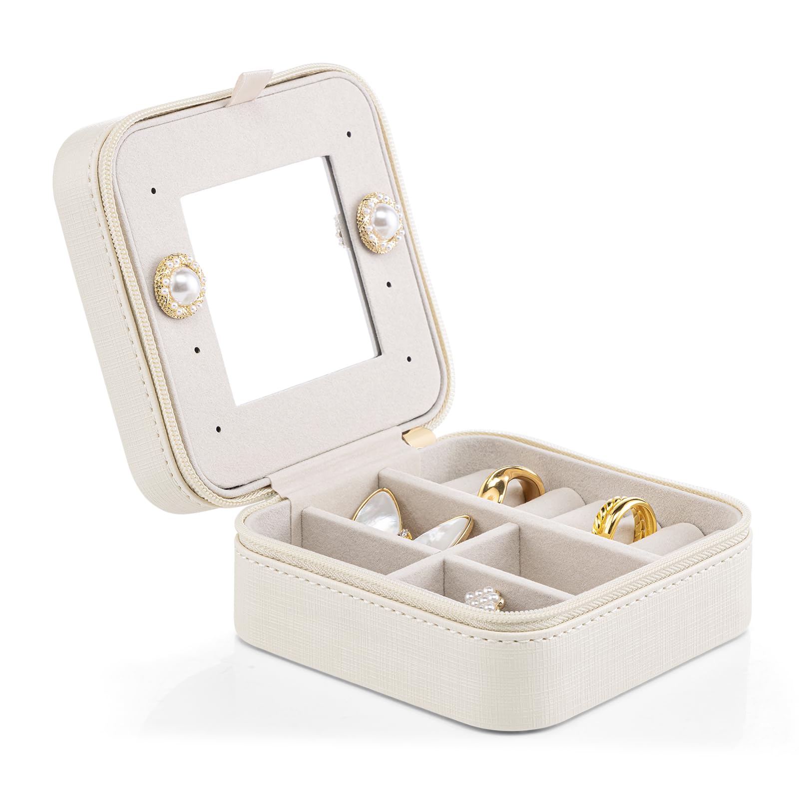 Vlando Small Travel Jewelry Box Organizer - Mirrored Carry-on Jewelries Necklaces Rings Earrings Necklace Storage Case, Beige