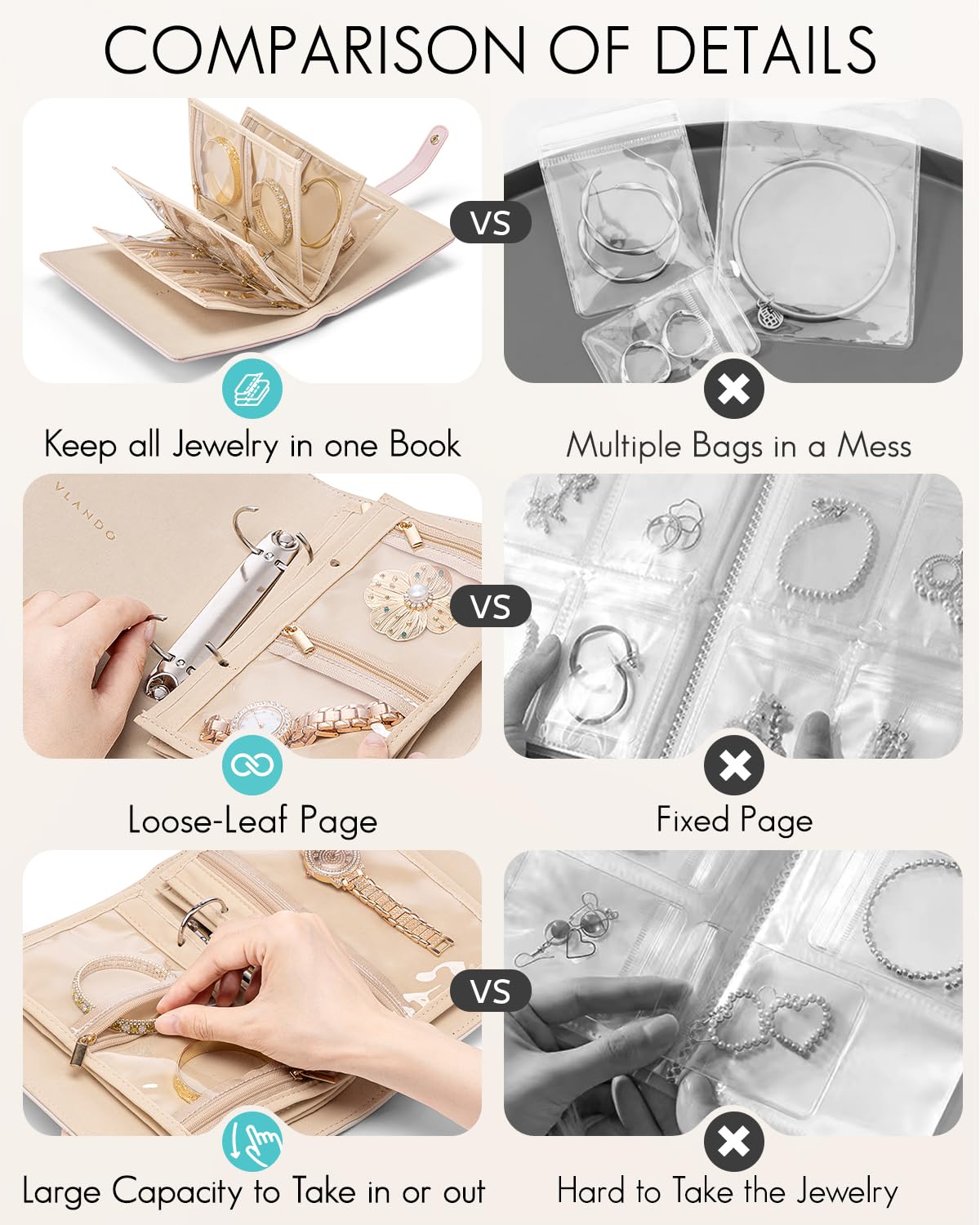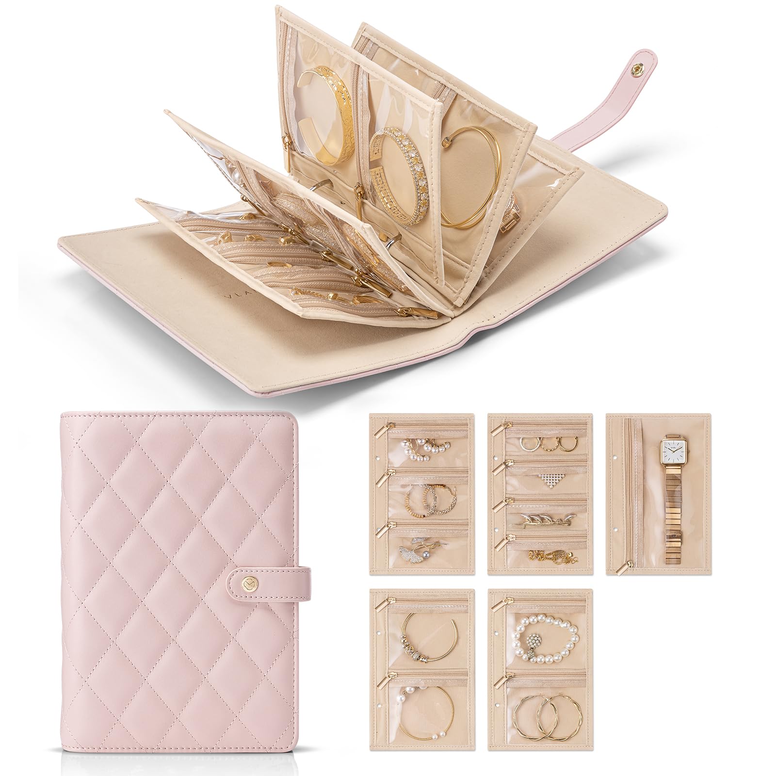 - Partitions Storage: Vlando jewelry case have 5 loose-leaf pages with metal binder rings(include 1 Page for large gird+ 2 Pages for medium grids +3 Pages for small grids ),can accommodate various types jewelry. Enough for your 5-7 days traveling or daily use