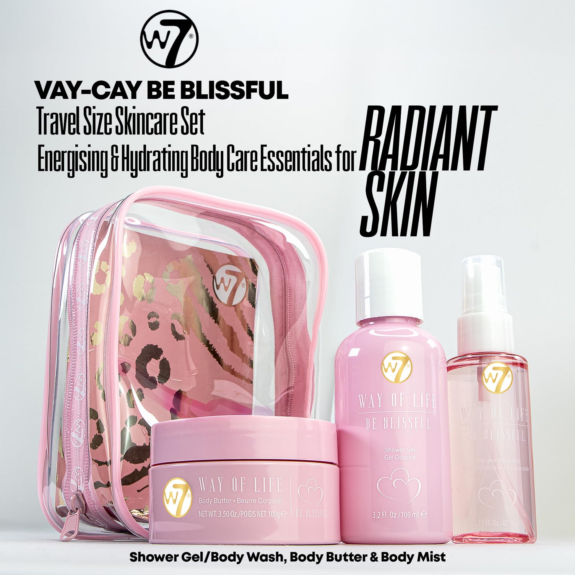 W7 VAY CAY Be Blissful - Travel Size Skincare Set | Carry On Luggage Essentials: Shower Gel & Body Wash, Body Butter & Body Mist | Energizing & Hydrating Body Care for Glowing Skin