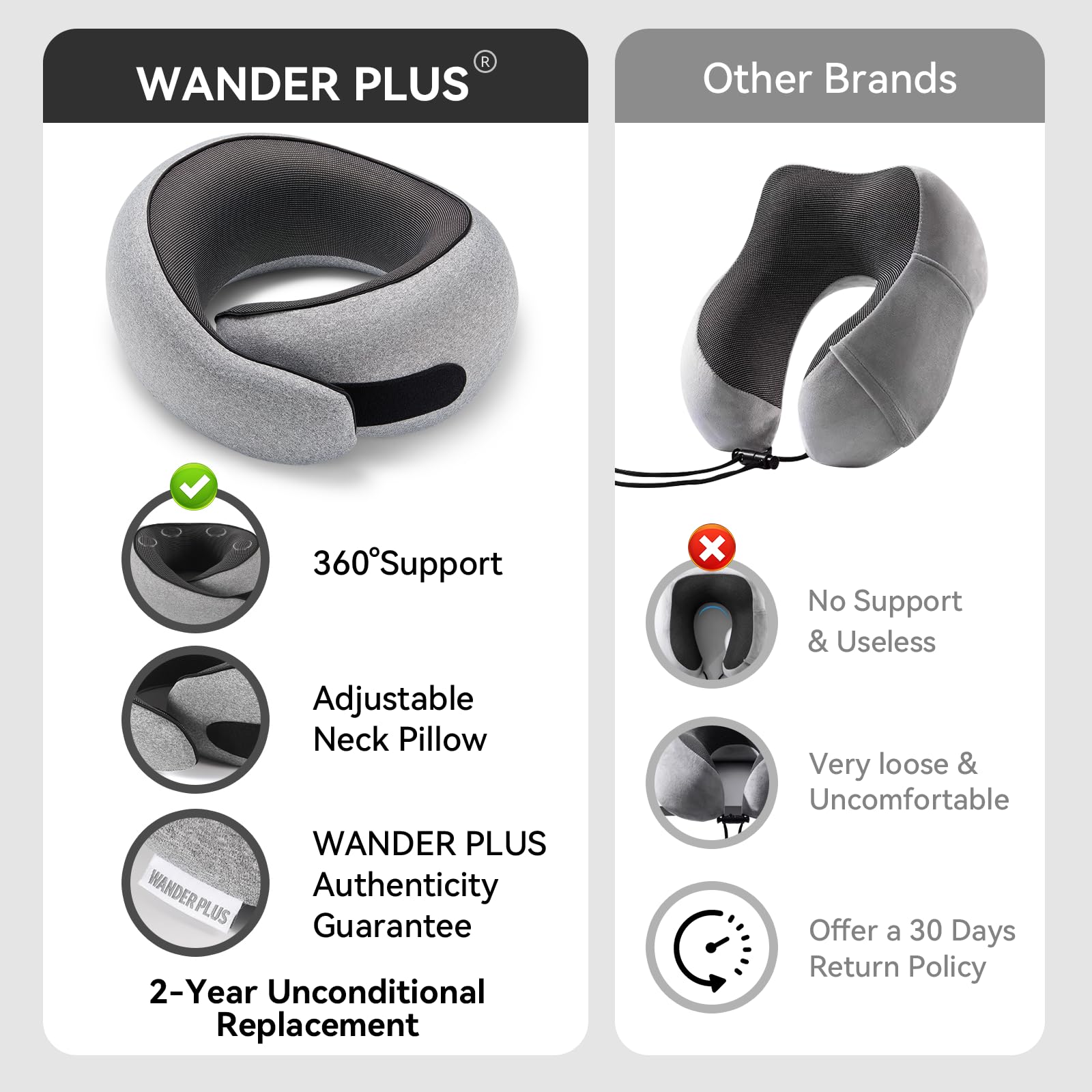 WANDER PLUS® Travel Pillow, 100% Pure Memory Foam Travel Neck Pillow Airplane Neck Support Ergonomic Design Best for Sleeping Plane Car Train Office Flight for Adults Grey
