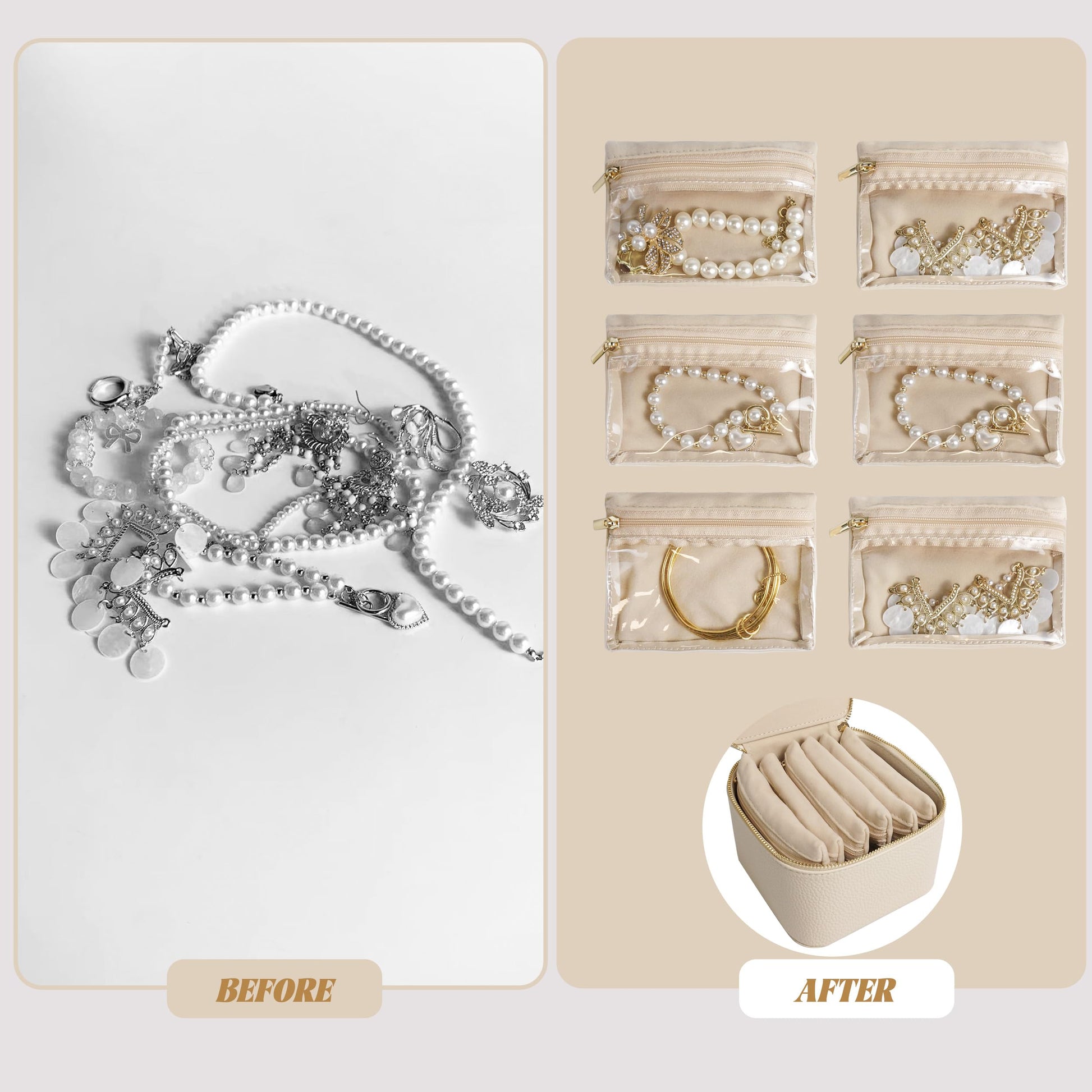 - Quality Materials: This travel jewelry case set includes a size 5.1x 5.1x 3.3 inches supple PU leather jewelry box, 6 pcs velvet zipper jewelry bags, removable zipper head