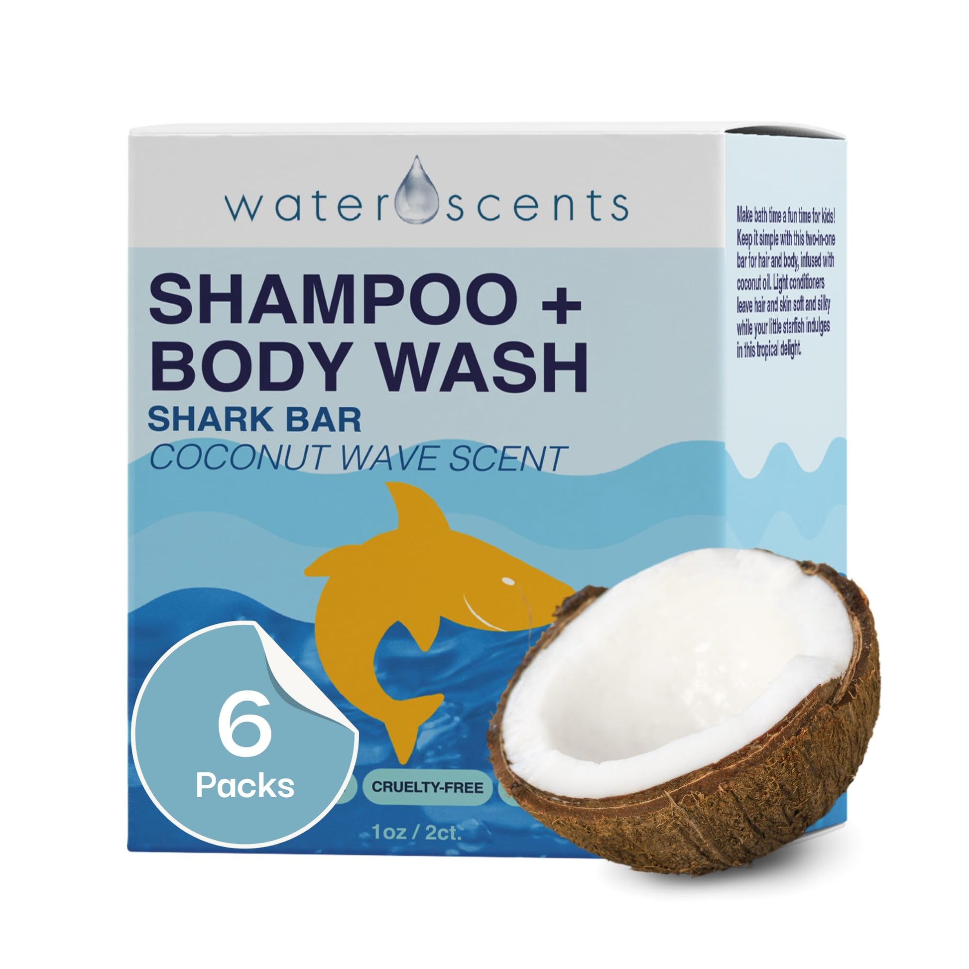 Water Scents 2-in-1 Shark Bar Shampoo & Body Wash – Coconut Wave | Natural, Vegan, Moisturizing Bar Soap for Hair & Skin | Solid, Travel-Friendly, USA Made | 6 Packs