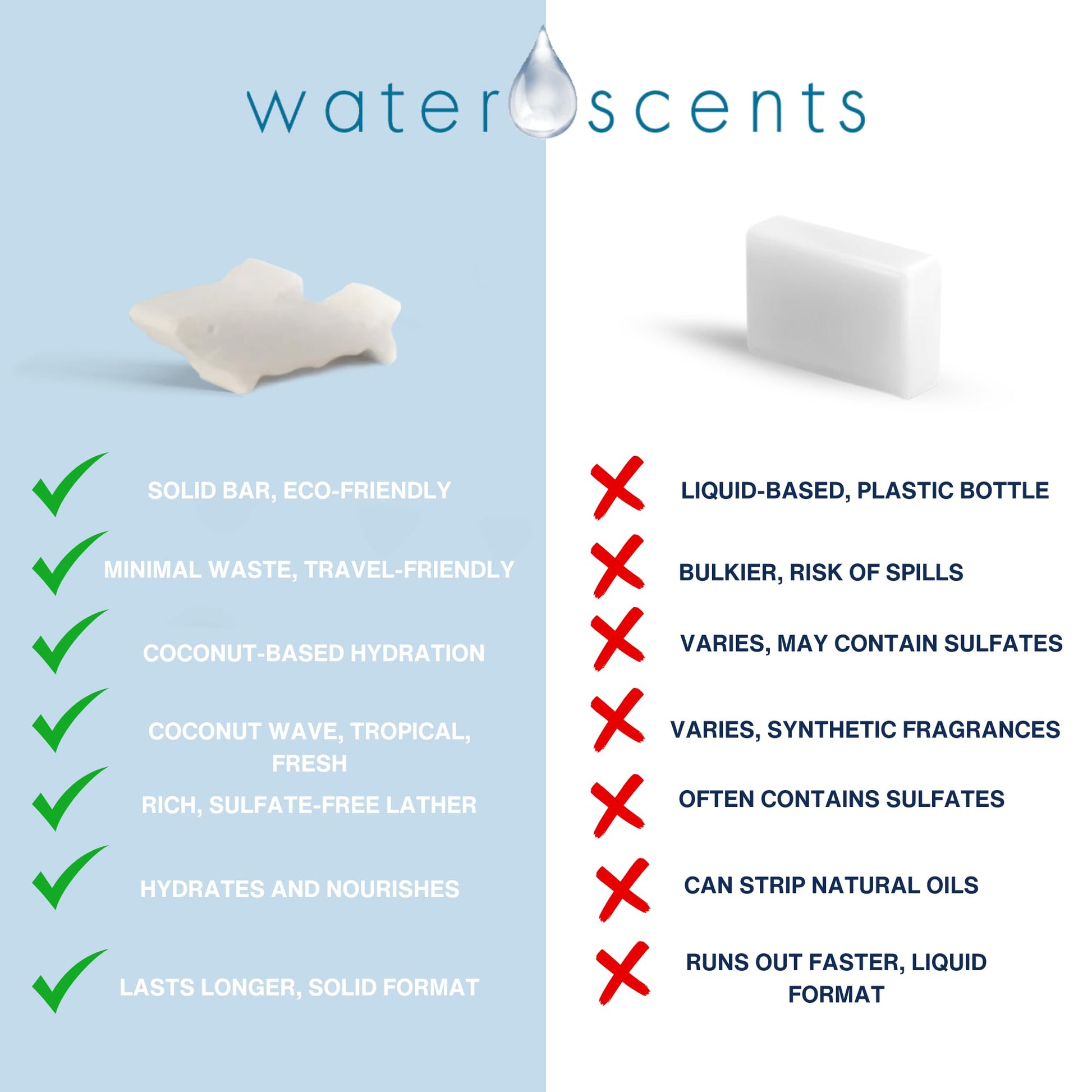 - Tropical Coconut Scent for Hair and Body – Indulge in the refreshing aroma of Coconut Wave while cleansing from head to toe. This 2-in-1 solid shampoo and body wash bar leaves your skin feeling soft and your hair smooth, with a clean, beachy scent that lasts.