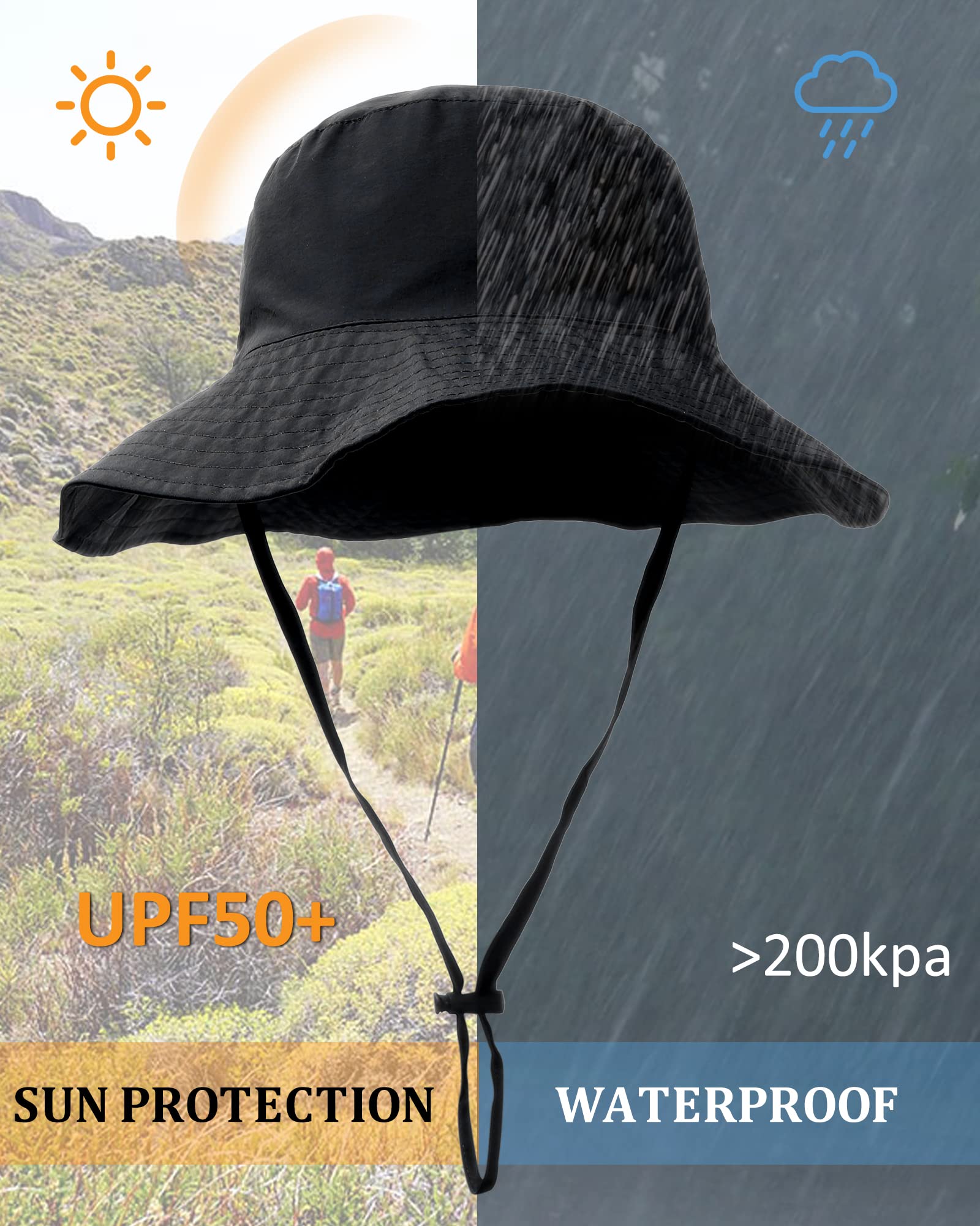 - Waterproof for the beach-The mens floppy waterproof sun bucket hat is made of premium waterproof nylon material. Soft, lightweight, waterproof, and also has UPF 50 + sun protection. The wide brim perfectly covers your face and neck from the sun's rays. The waterproof fabric prevents rain from seeping into your head.