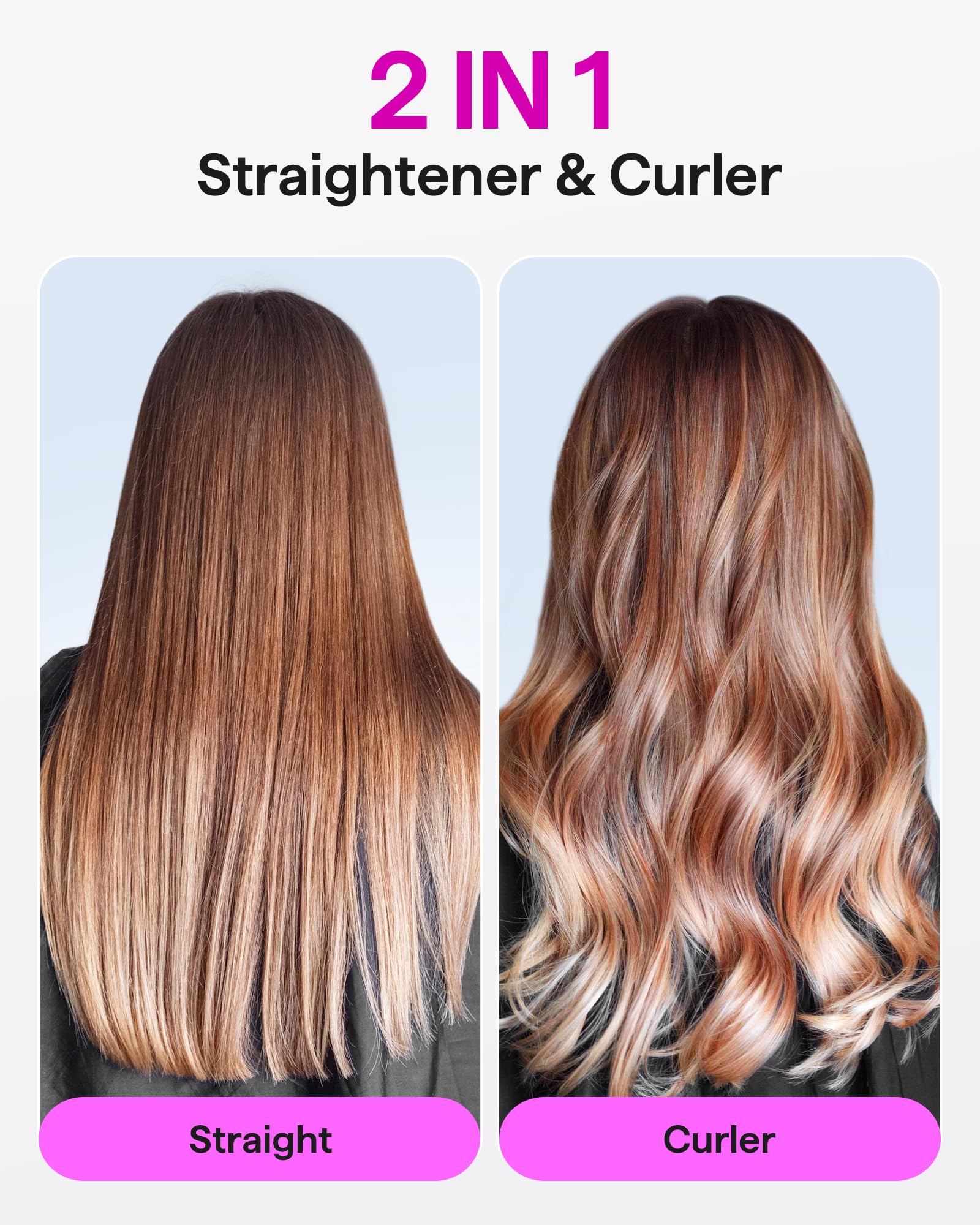 - 2-in-1 Styling Tool: Designed to handle all your styling needs, this flat iron effortlessly straightens, waves, and curls, catering to a variety of hair types. Glide the styler through your hair to achieve sleek, straight looks, soft waves, or defined curls. Its unique edge design offers exceptional versatility, allowing you to create a range of styles from polished and smooth to beautifully textured