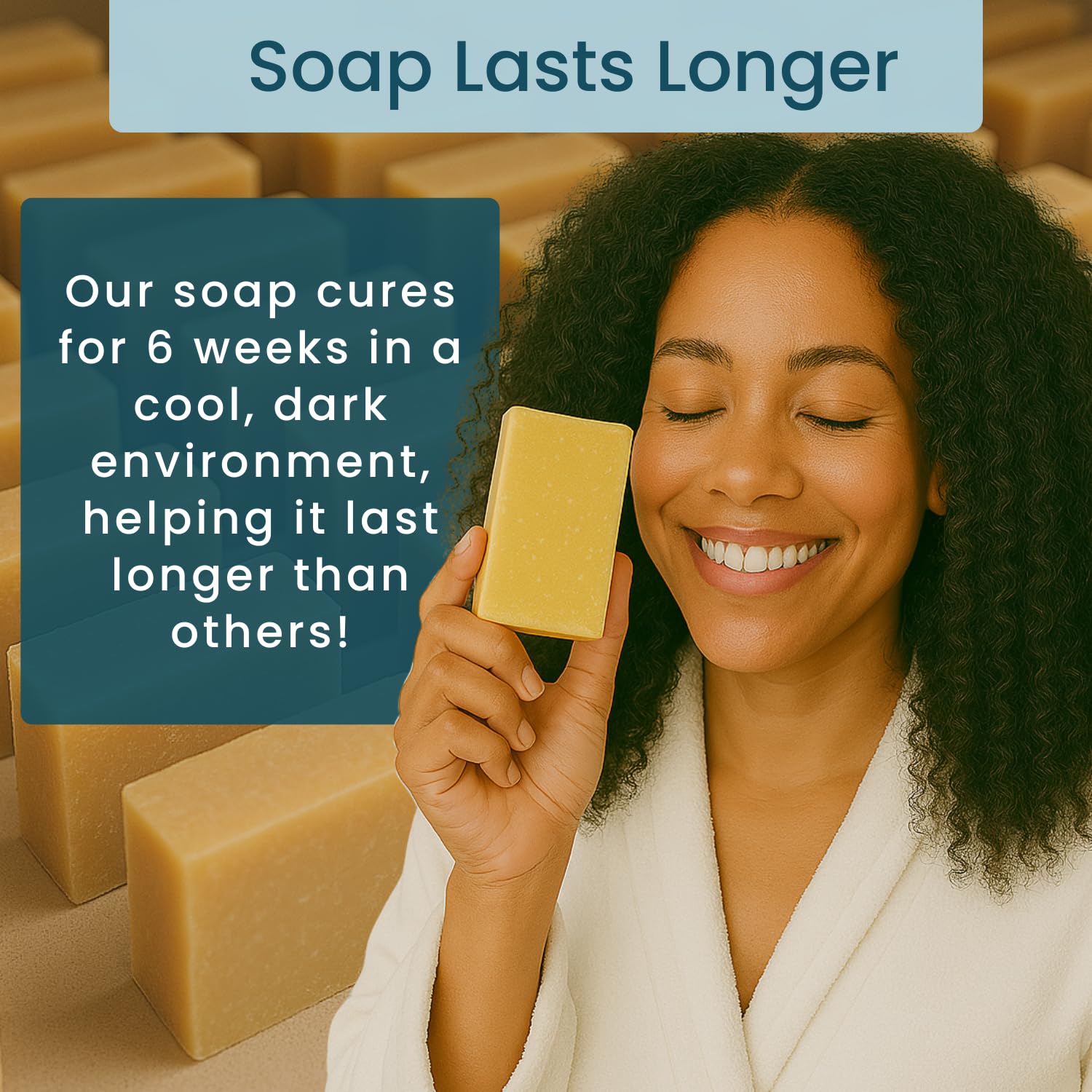 - Handmade in America: Our artisan, cold process, natural soap is aged for a minimum of 6 weeks in a cool, dark environment. This allows it to fully cure, making it last longer than other soaps.