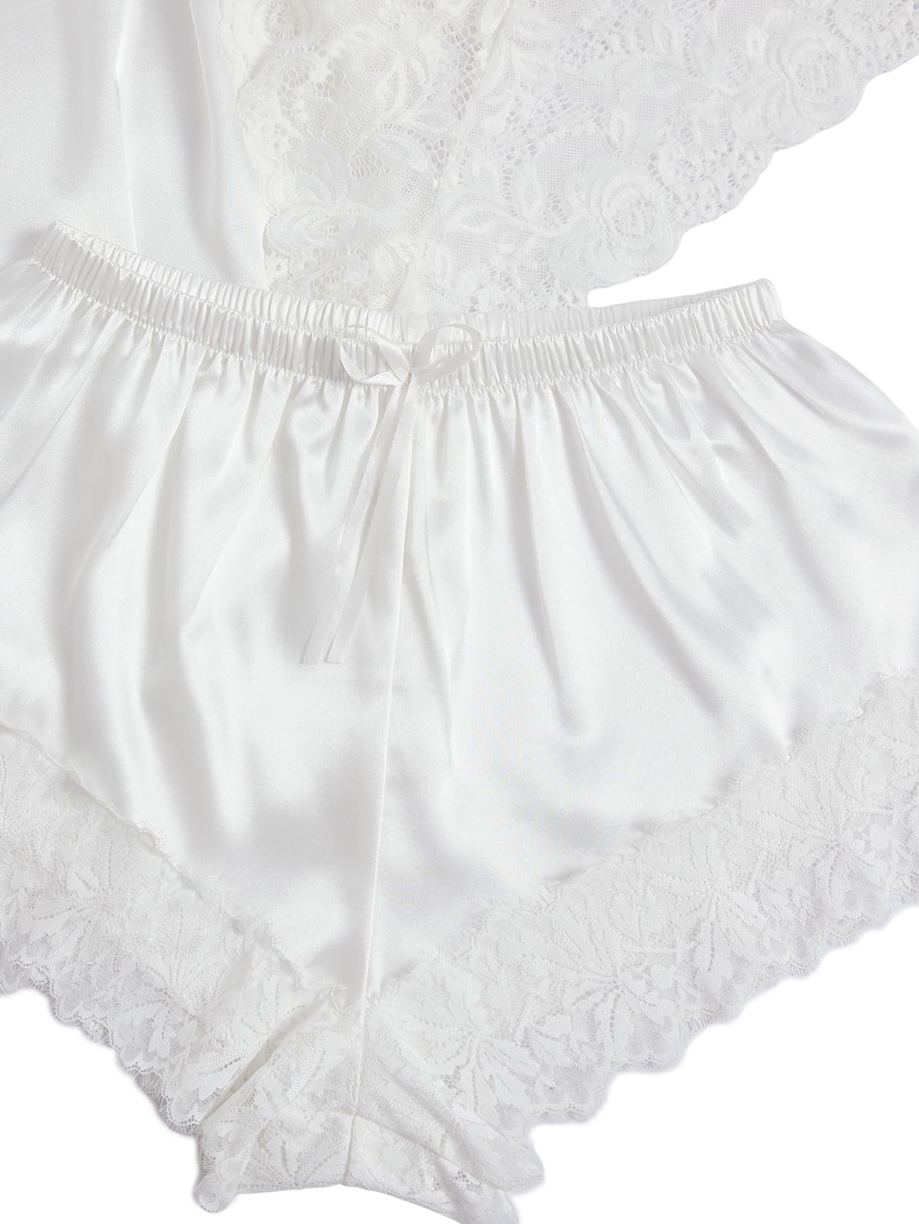WDIRARA Women' Silk Satin Pajamas Set 4pcs Lingerie Floral Lace Cami Sleepwear with Robe Snow White M