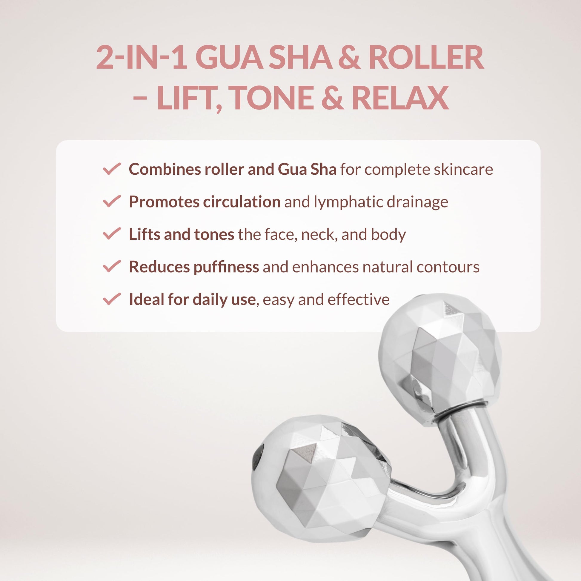 - Two tools in one: Enjoy the power of a face roller and gua sha in one sleek tool; lift, sculpt, and refresh your face, neck, and jawline every day
